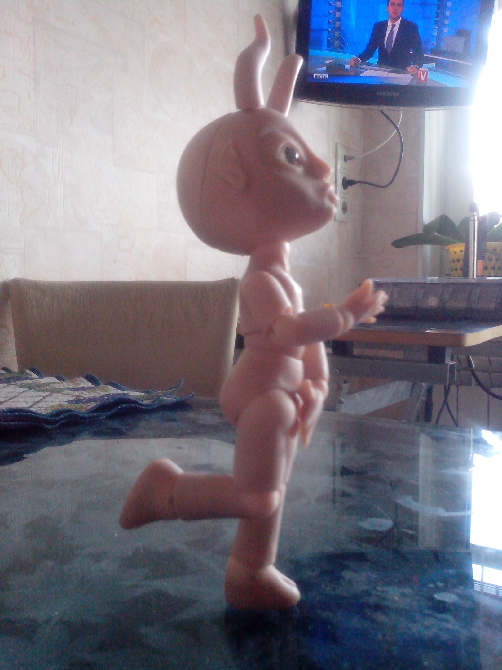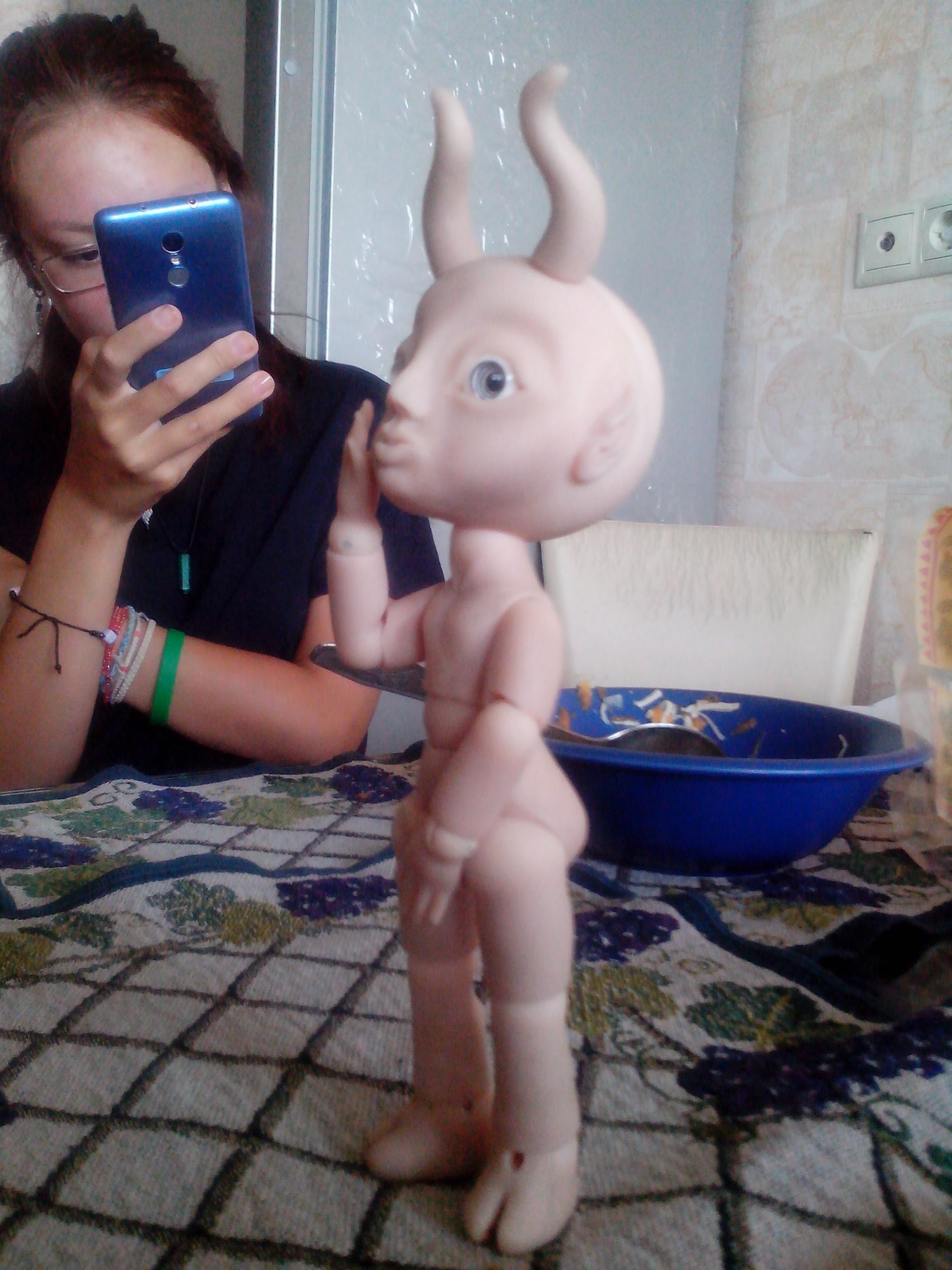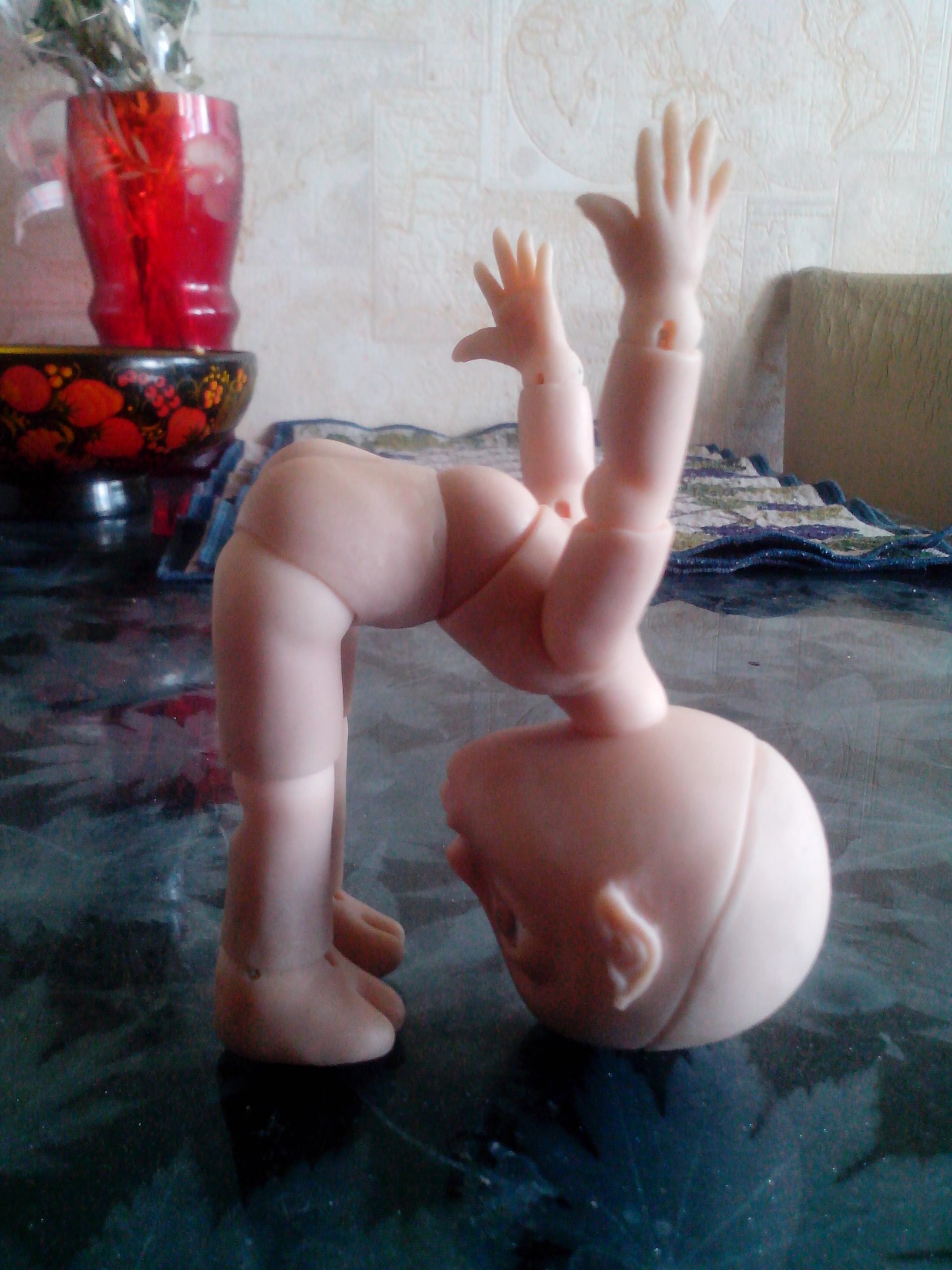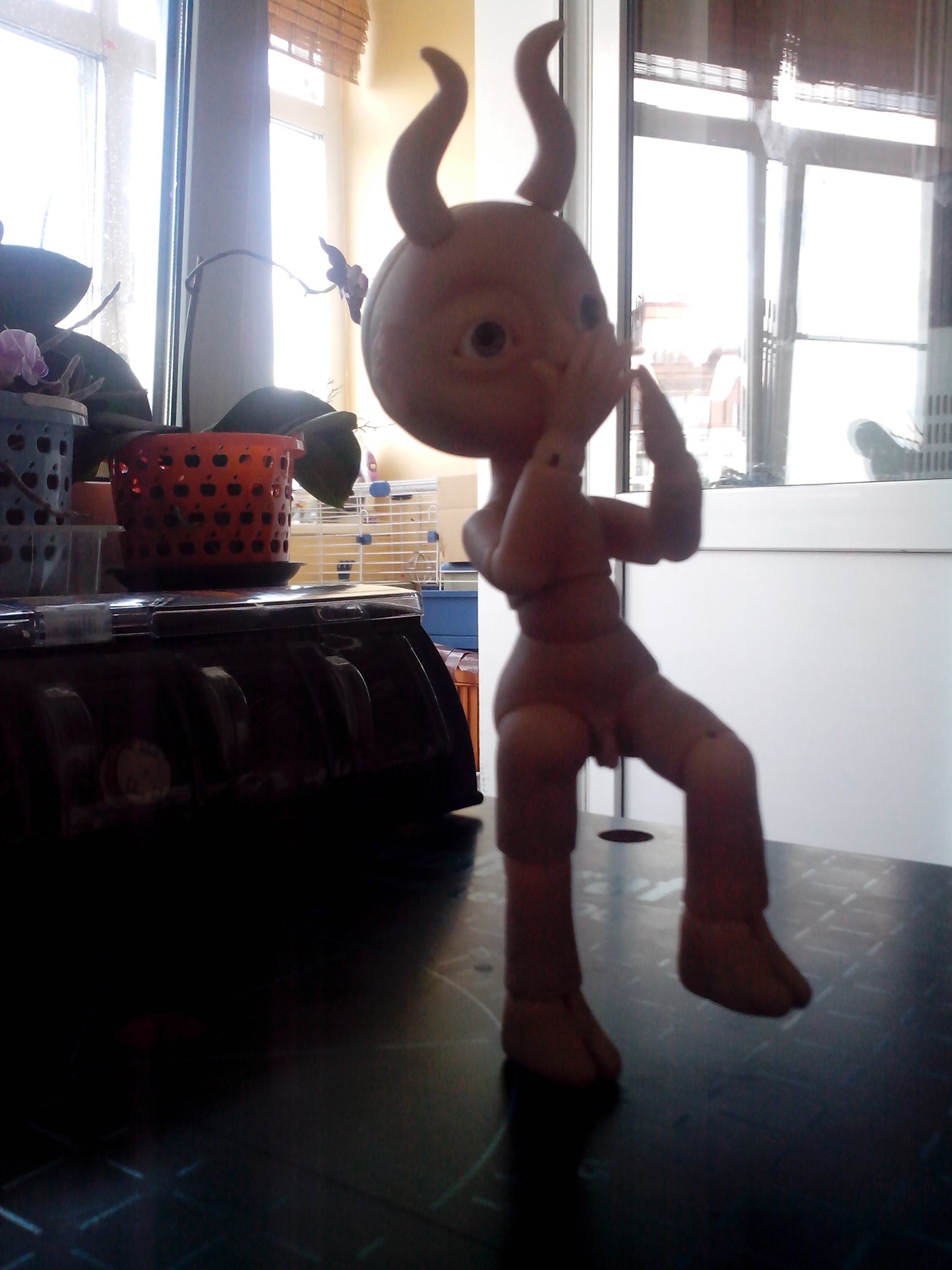 «Я что балериной заделался?» (Коротковаты предплечья, рез под резинку в шарнире левой ладони ушел на бок — этот дефект видела сразу при пропиливании, но так хотелось поскорее малыша собрать, что оставила как есть — по хорошему нужно слепить новую ладошку или хотя бы новый шарик для этой — пока что лень)
