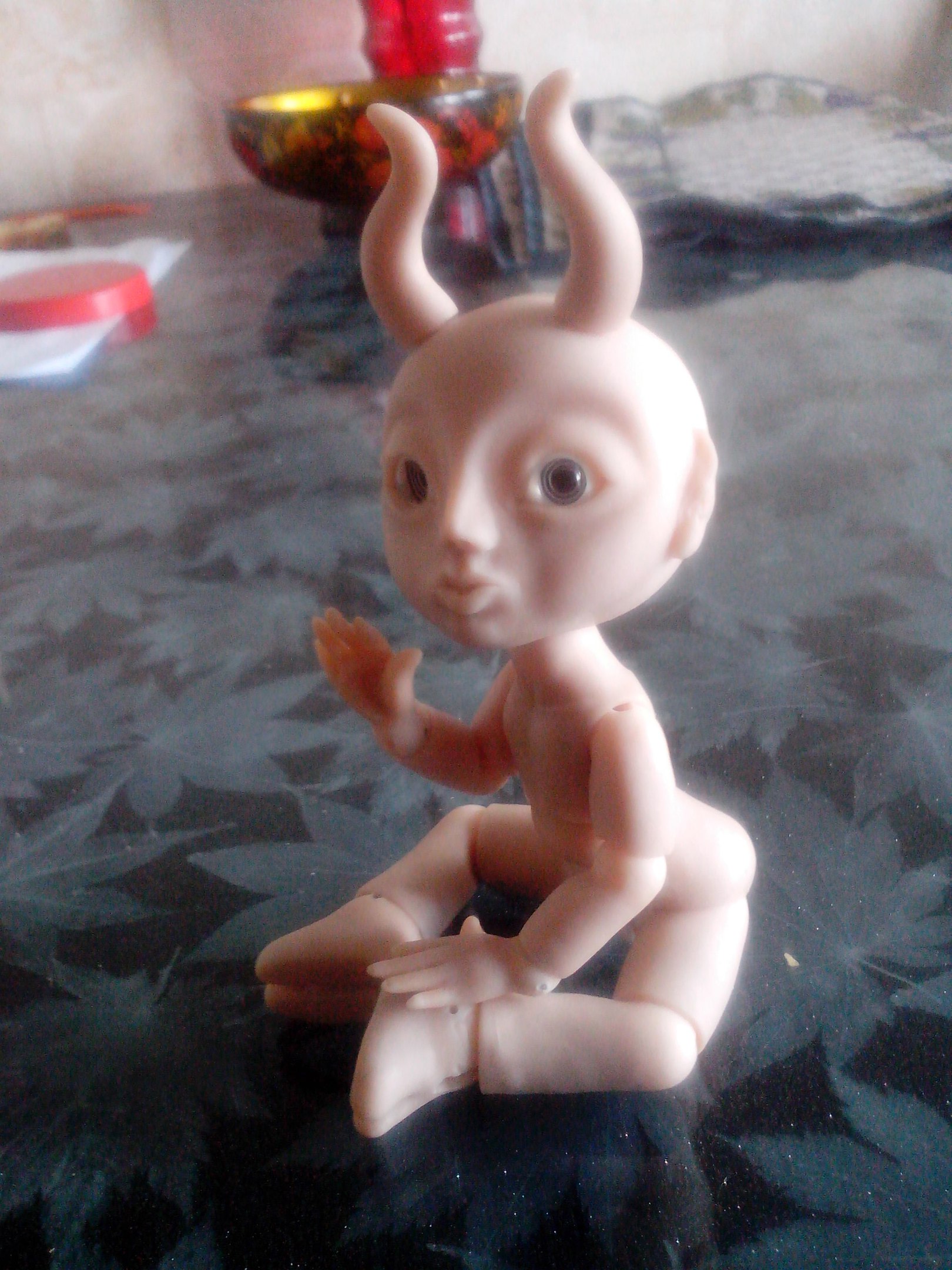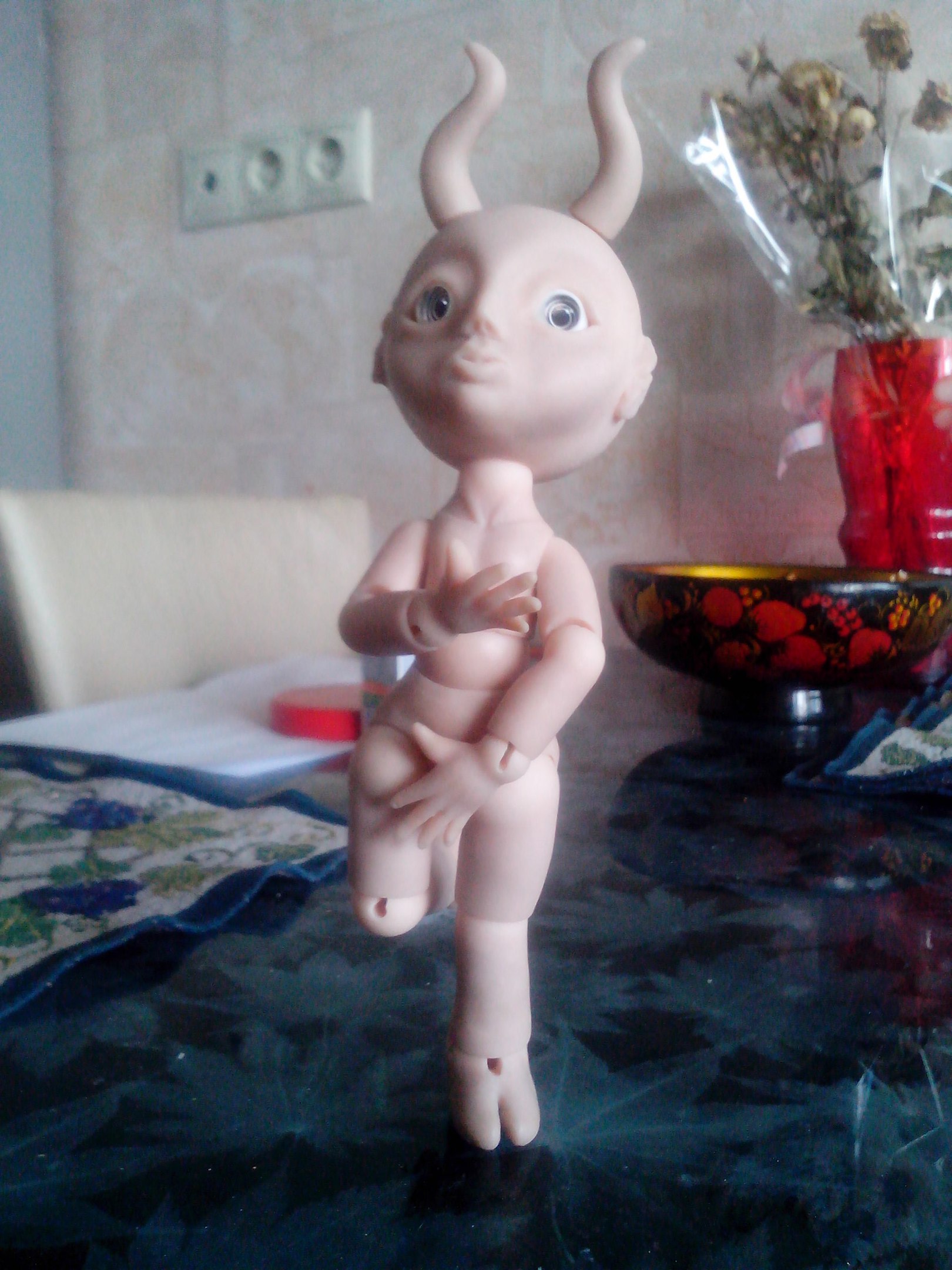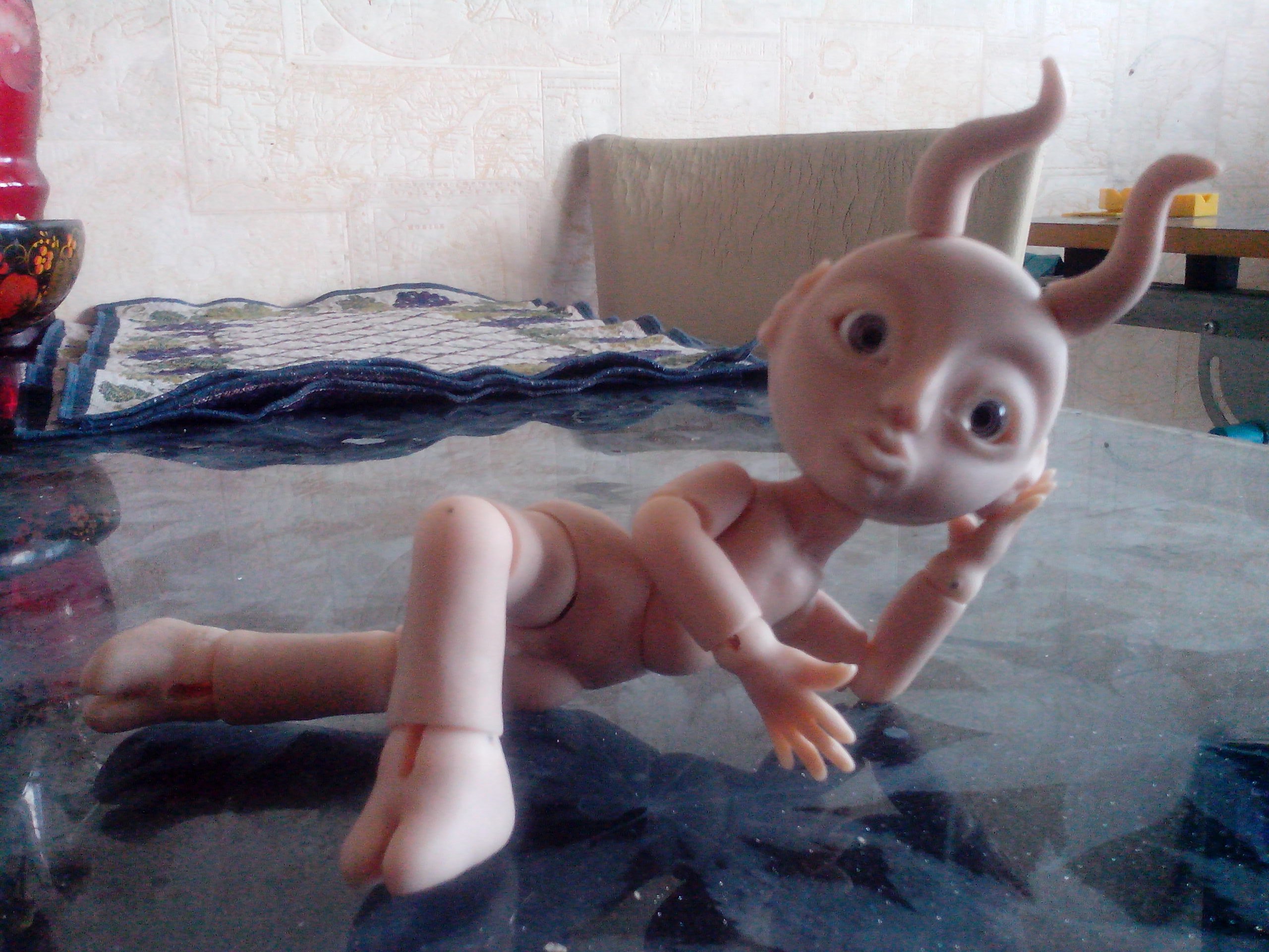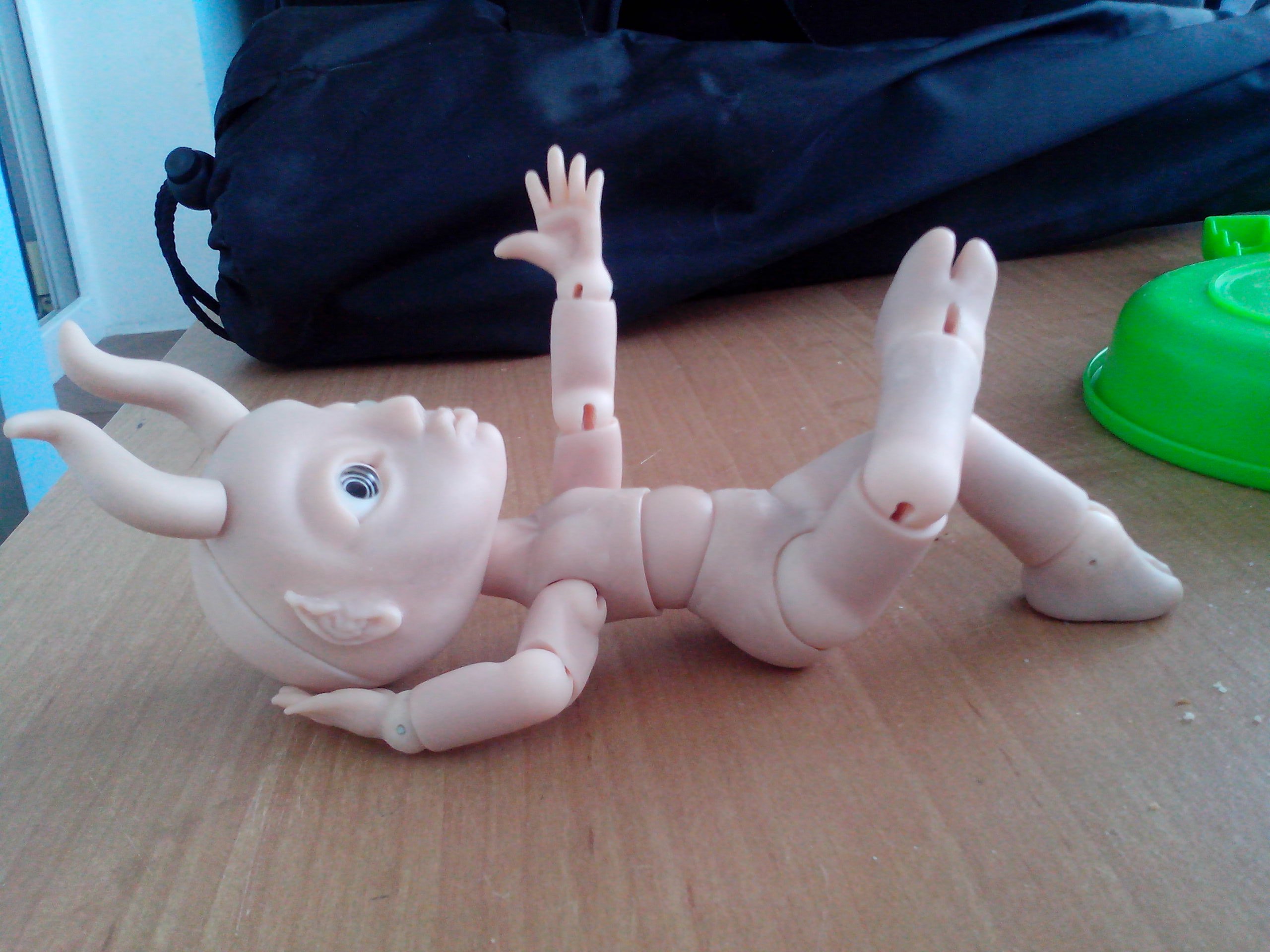 Вернулась из отпуска и продолжаю мучить Маленького Демона, свою шарнирную куклу. Углубила шарнироприемники в пузе и голове. Вклеила все необходимые магниты. Сделала крючки для крепления ступней и ладоней. Натянула резинки потуже. Многое еще нужно поправить — из того, что резко бросается в глаза, шарниропримники в локтях.