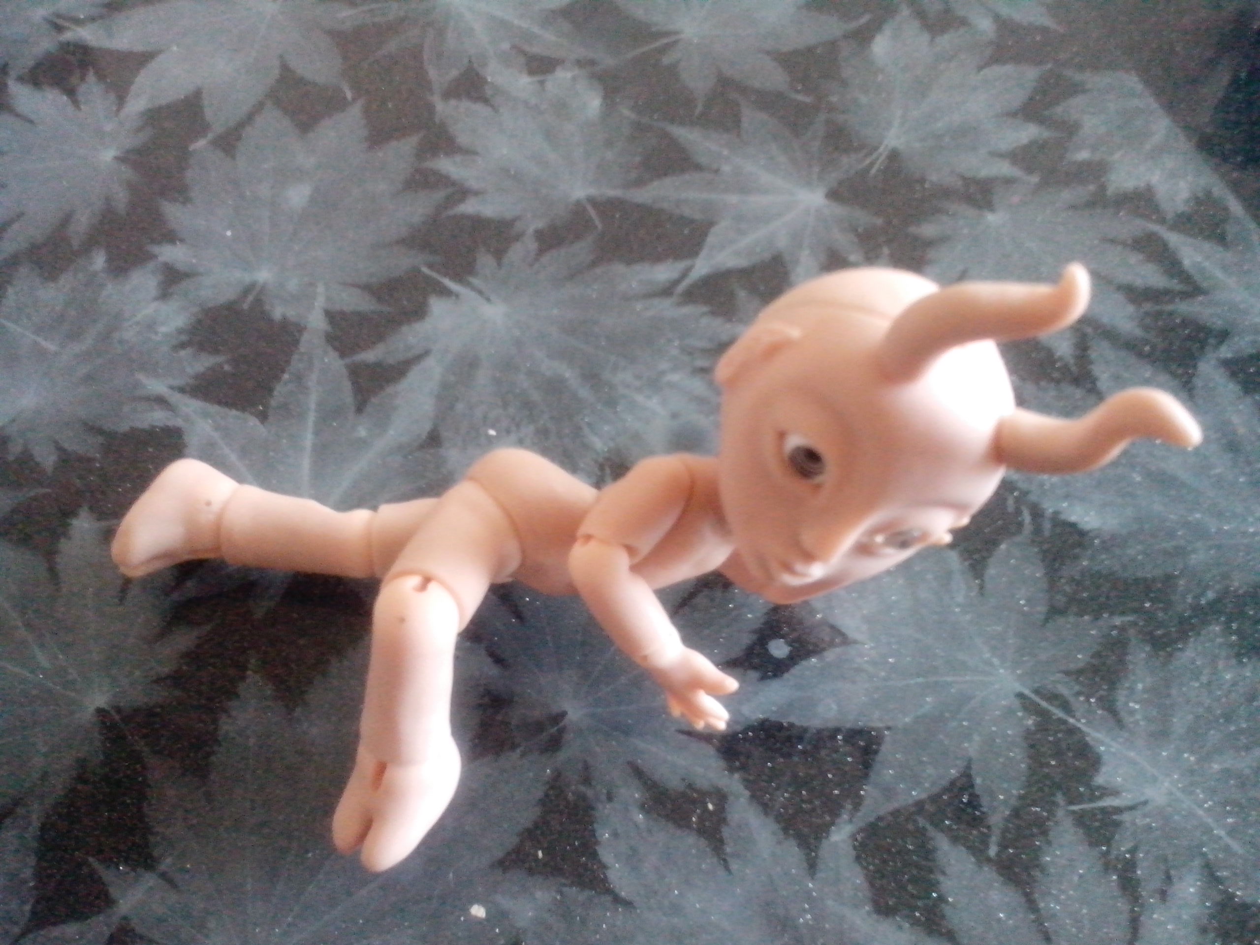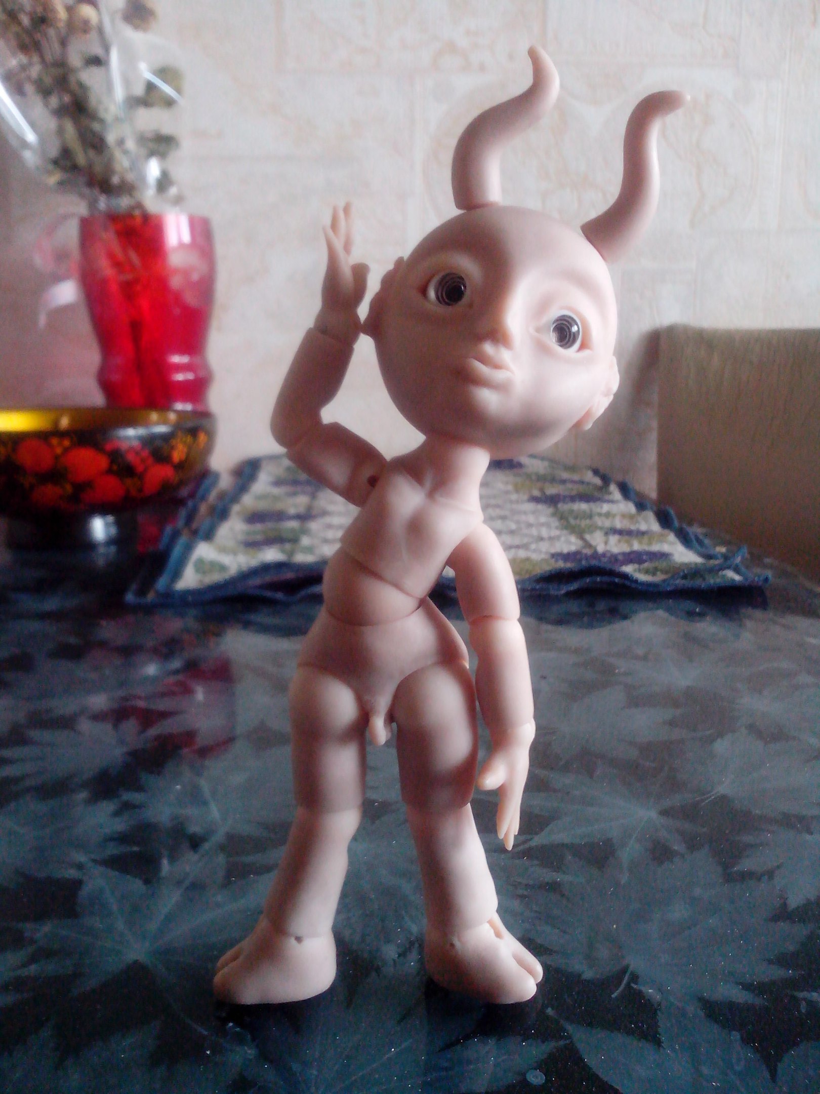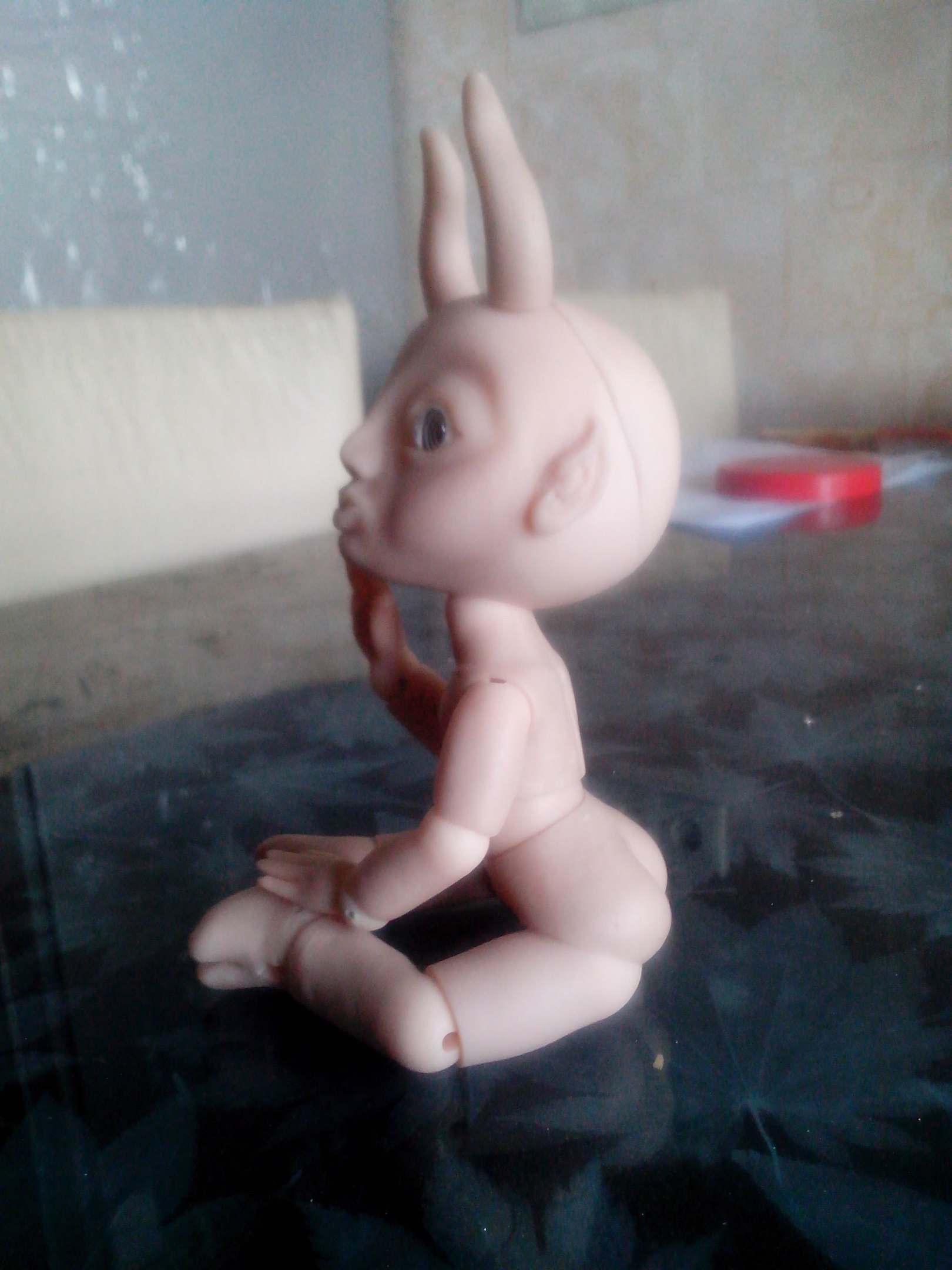 Вернулась из отпуска и продолжаю мучить Маленького Демона, свою шарнирную куклу. Углубила шарнироприемники в пузе и голове. Вклеила все необходимые магниты. Сделала крючки для крепления ступней и ладоней. Натянула резинки потуже. Многое еще нужно поправить — из того, что резко бросается в глаза, шарниропримники в локтях.