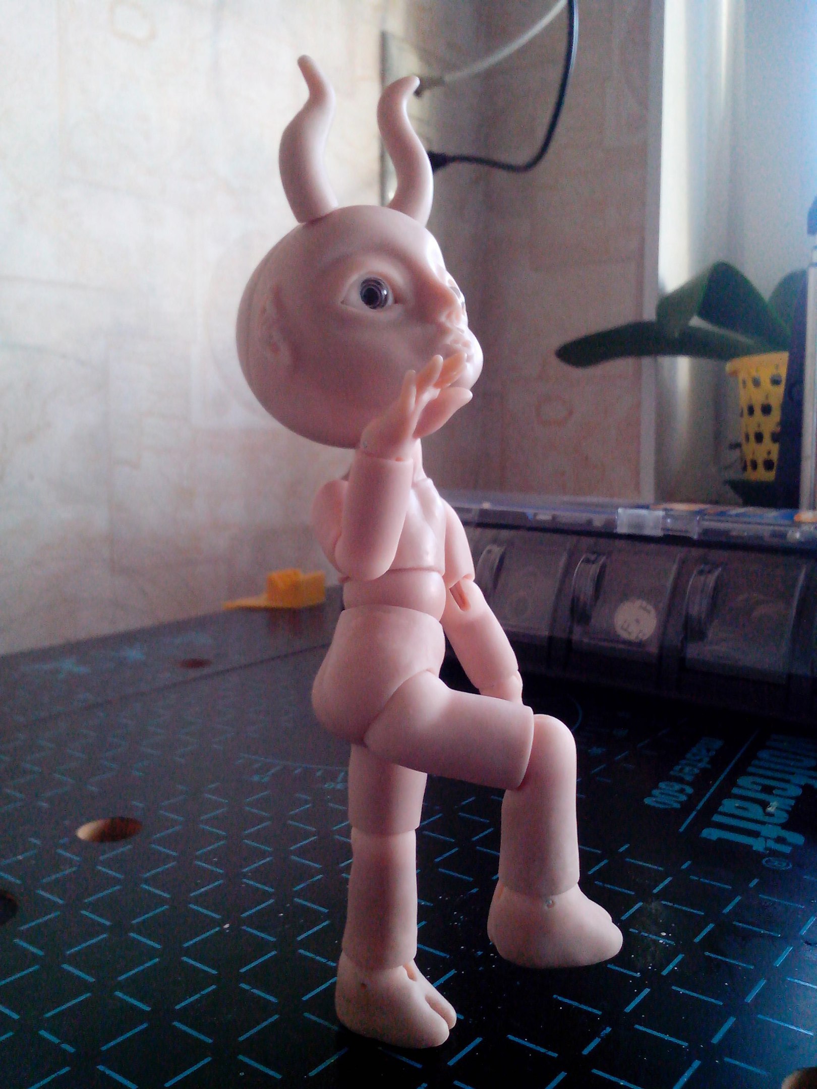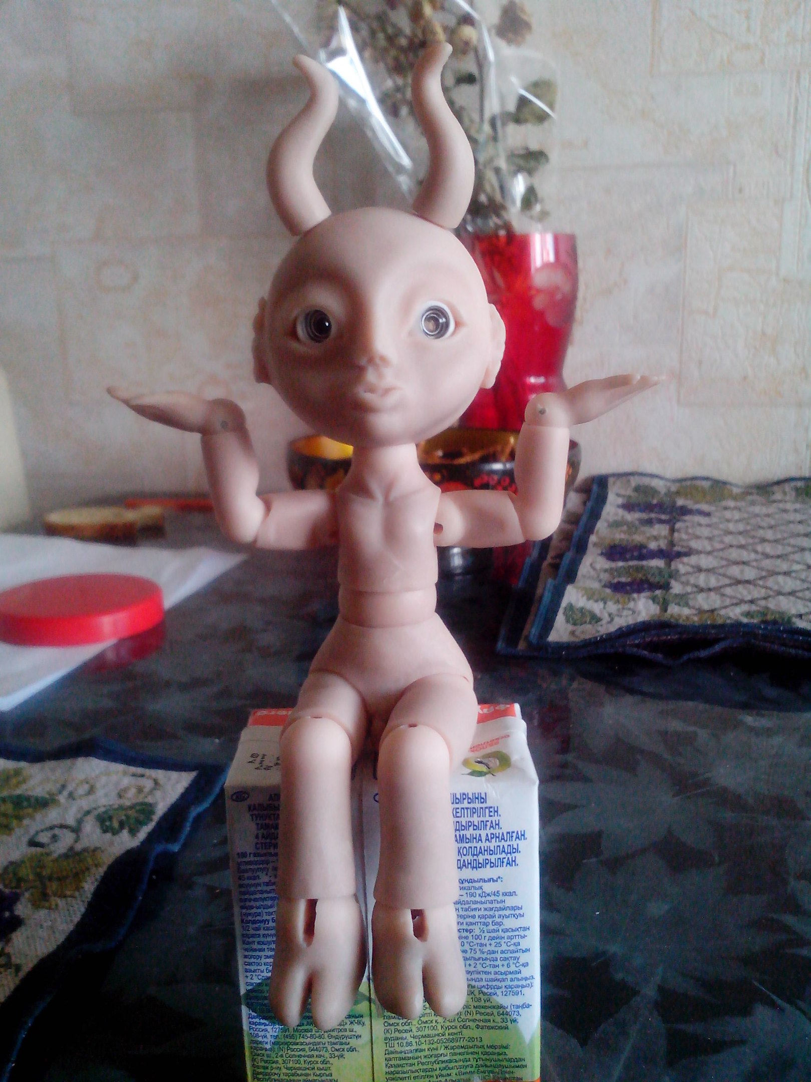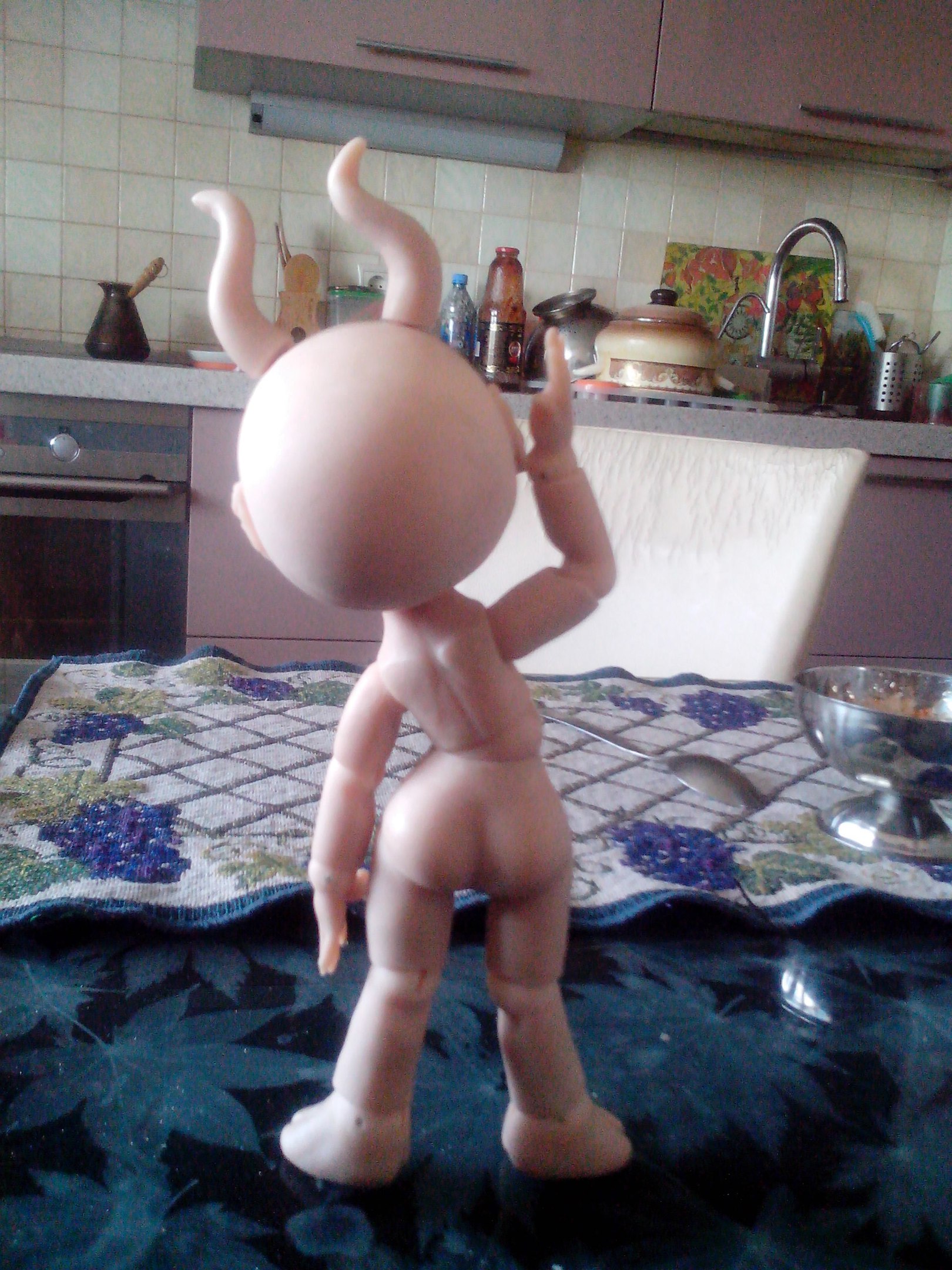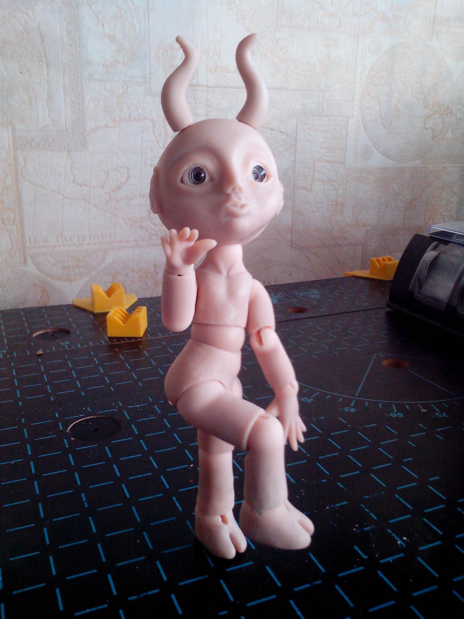 Вернулась из отпуска и продолжаю мучить Маленького Демона, свою шарнирную куклу. Углубила шарнироприемники в пузе и голове. Вклеила все необходимые магниты. Сделала крючки для крепления ступней и ладоней. Натянула резинки потуже. Многое еще нужно поправить — из того, что резко бросается в глаза, шарниропримники в локтях.