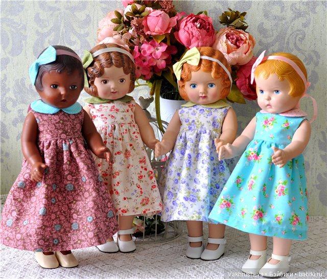 Куколки, которых я очень люблю и решила Вам показать, выпускались в 1991 году из приятного бархатистого винила в стиле 30-х годов. Их часто называют кулемочки а-ля 30-е годы. Ростик у малышей 30 с небольшим сантиметров. Рост у девочек 45 сантиметров.