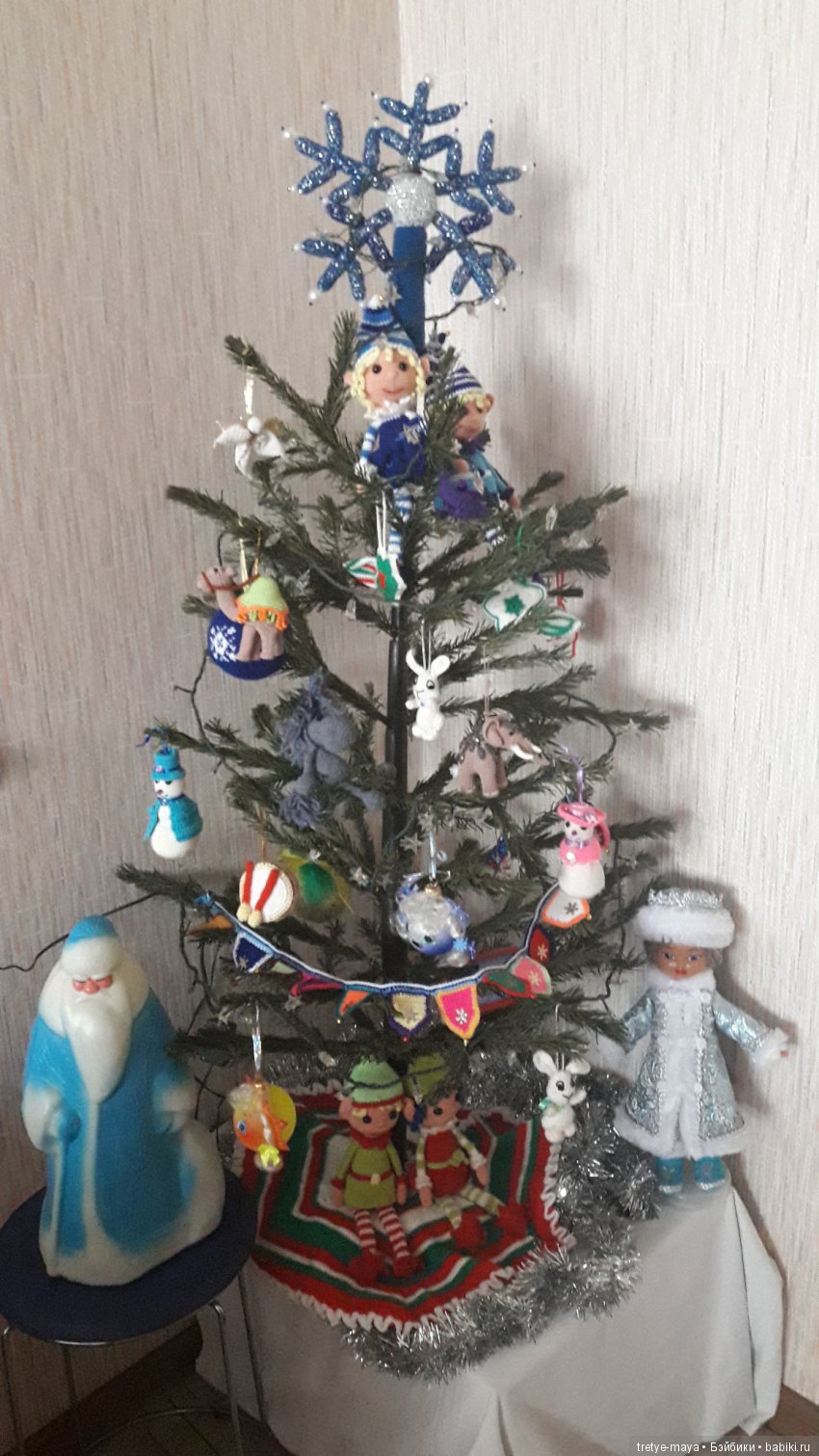 А это наша елка! Все игрушки, верхушка-снежинка и гирлянда связаны крючком.