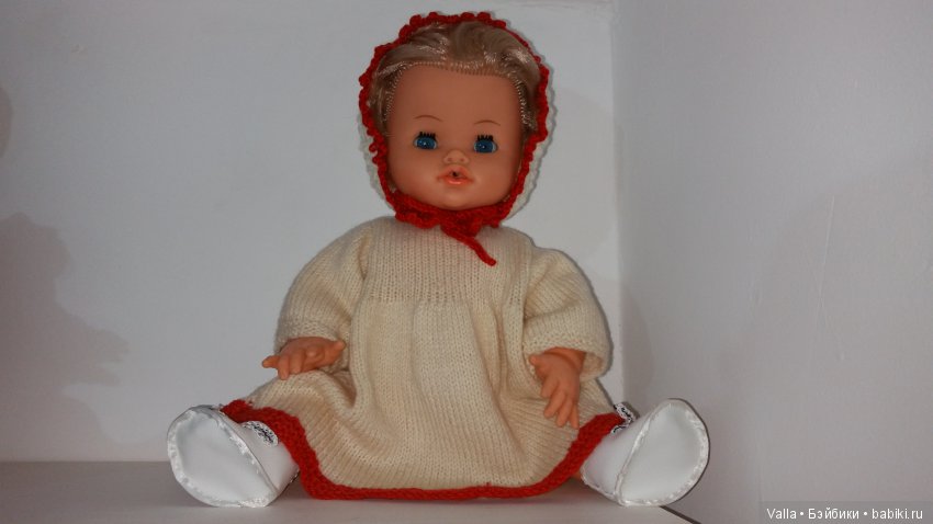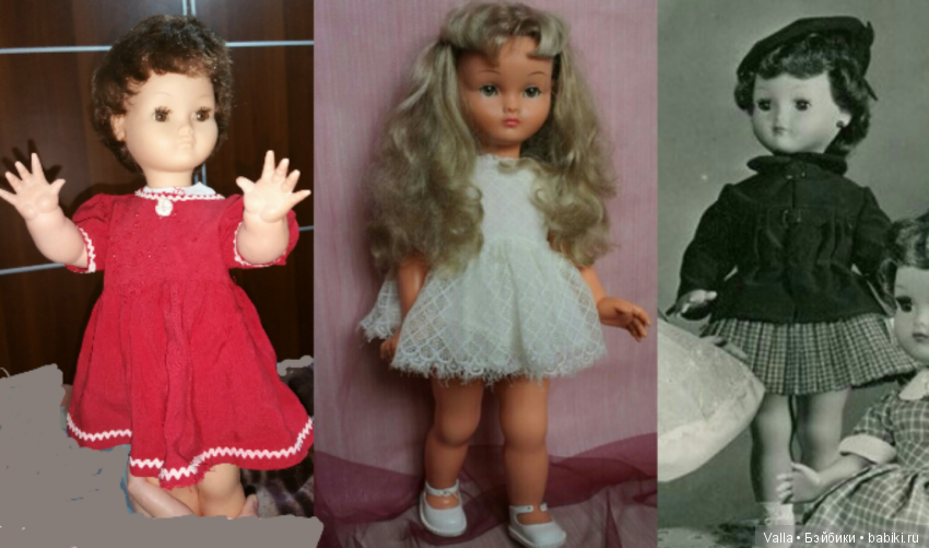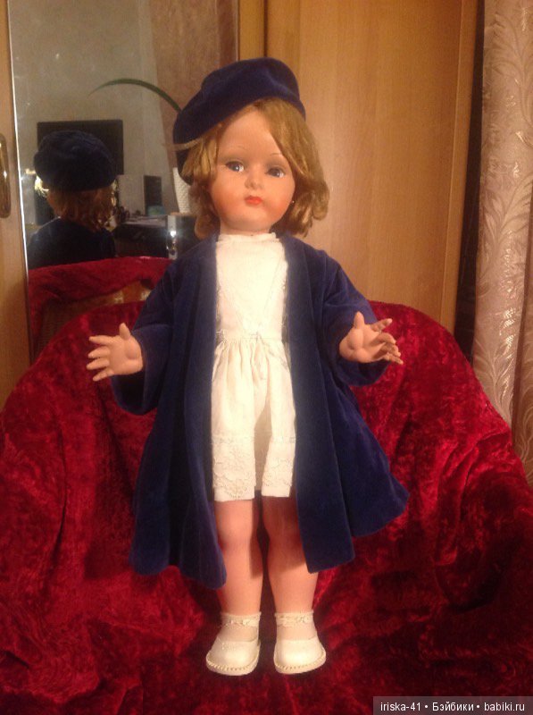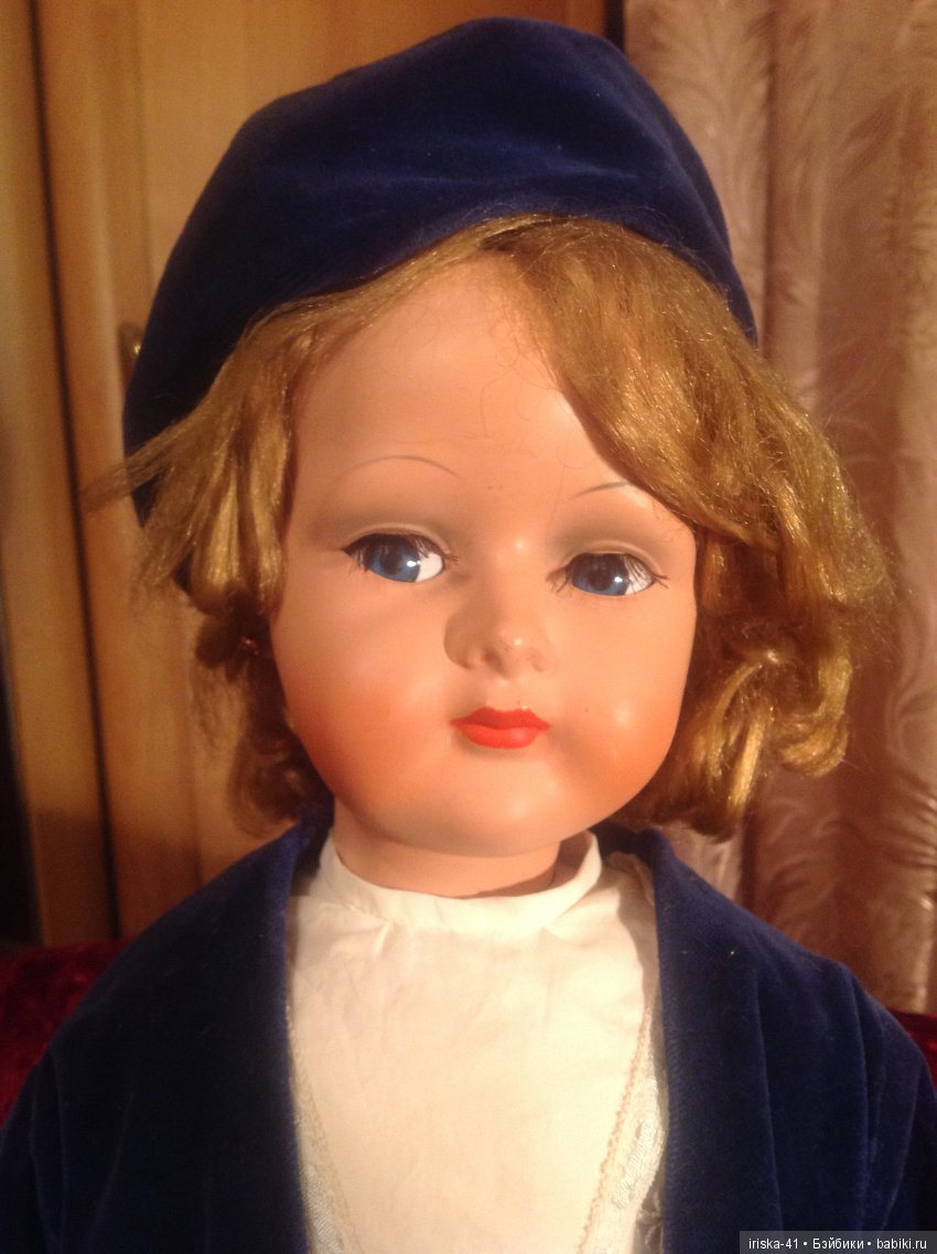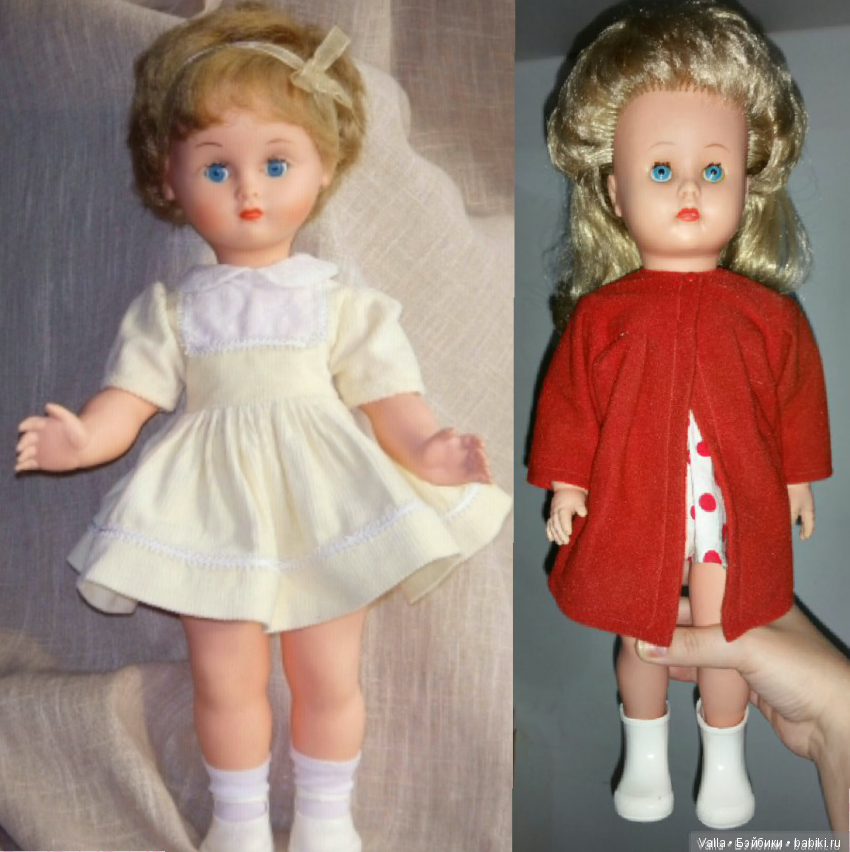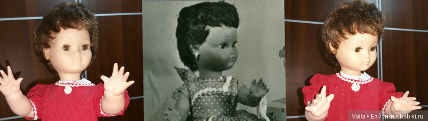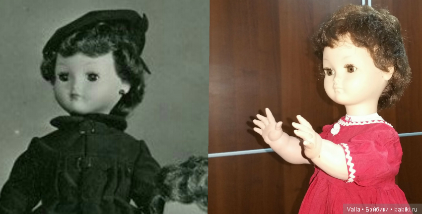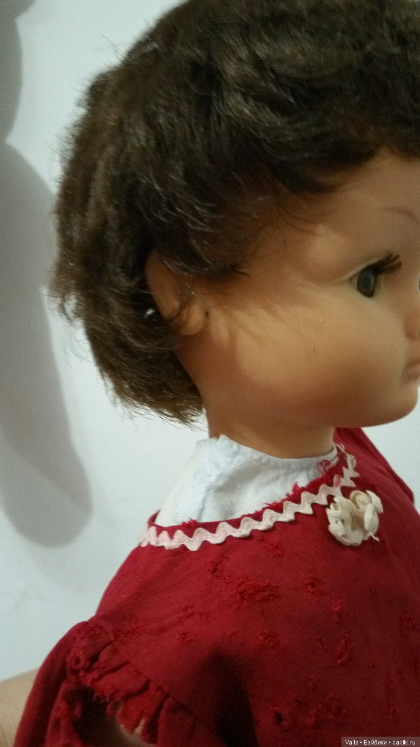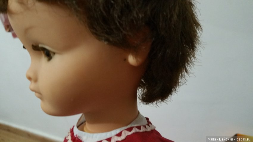 У неё как у антикварной куклы парик и пейт на голове картонный. И есть более поздняя, примерно как Ваша. Я думаю, что Ваша кукла семидесятых годов. Одежда у кукол очень красивая и конечно стоит сшить новое платье по образцу старого.