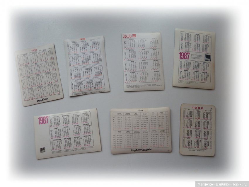 Дальше идут обычные, разложила их по годам. Среди них попадаются календарики, попавшие ко мне от моих друзей по переписке из Чехословакии, ГДР и Болгарии, помните, было у нас такое увлечение?