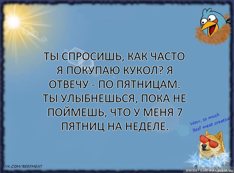 — Ах, сколько радости и удовольствия я получаю от кукол! Ты не представляешь, как они полезны для моей души! :)))