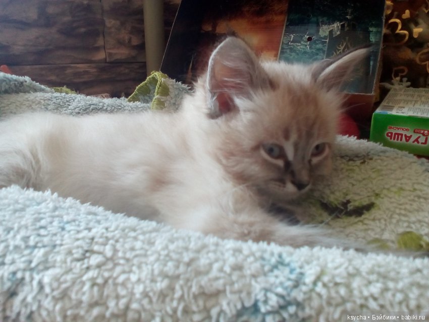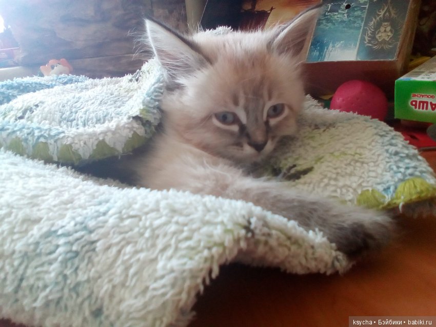Здесь уже чистенький, правда худой еще. Сейчас здоровый, толстый, 5 кг весит. Кстати, мы его так и не мыли. Сначала рана, потом лапы сразу болеть начали. Сам вылизался, шерстка белоснежная, кожа розовенькая. И интересно, он совсем не линяет)))