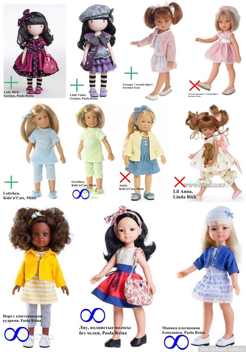 Я вот даже не поленилась сейчас быстренько по своим записям составить коллаж по вашему образцу. Первое фото — это виш-лист на первую половину 2017 года. Зеленый плюсик — купила, красный крест — передумала, синяя бесконечность — раздумываю, «отодвинуто на попозже». И второе фото — те куклы, которые были куплены за первую половину 2017 года внезапно, без плана, просто «очень захотелось».