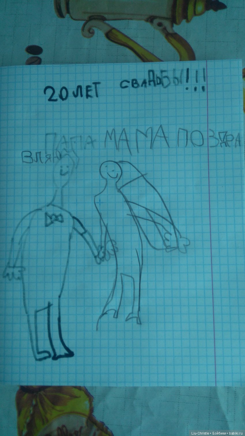 Мой тоже меня рисовал… гротеск. но видение ребенка отчасти правдиво- на рисунке глаза в поллица, крошечный рот, три прямые волосинки… похоже. волосы у меня тонкие, глаза большие, рот маленький… портрет висел на холодильнике, гости, проржавшись- иначе не скажешь- говорили- а похоже!!!