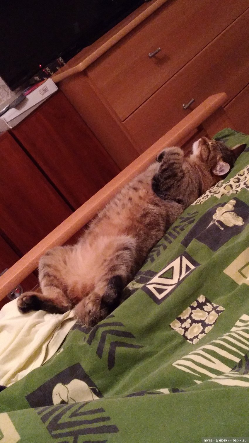 Эта хитрая морда очень боится детей, после одного случая… И вот раньше, когда приходили в гости дети, она с лёту проскальзывала по кровать и лежала там до их ухода. Но потом она перестала так делать, потому что все дети её и сами боялись. Выросла, потолстела. Но год назад к нам приходили новые друзья с бесстрашным ребенком, который полез к животине. А она испугалась, побежала под кровать и… Застряла. Вот прямо застряла, распластав задние лапы в шпагате. И начала истошно орать. Пришлось поднимать кровать и вызволять бедняжку)))