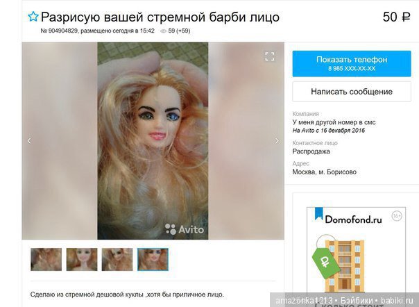 Начнем, пожалуй, с реальных об'явлений на всем известных сайтах, типа, Авито и Юла Надеюсь, я этим ничьих прав не нарушаю, ведь все это выложено в интернете в открытом доступе, а мы же с вами здесь все любим кукол и должны знать, сколько они стоят на других ресурсах. Все данные продавцов и ссылки на сторонние ресурсы вроде обрезала.