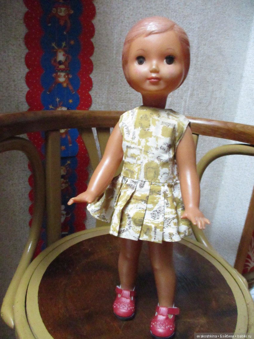 Куколка была маленькая, 20-25 см, с тряпичным тельцем, голова и ладошки были твердые, и не помню, был ли это целлулоид или все же пластик. Какой- то он был костяной на ощупь, не, как полиэтилен. А вот ножки мне помнятся целиком тряпичными, и на них были нарисованы туфельки. По- моему, красные, и, возможно, были нарисованы и носочки. В звездочковой теме на ДП меня пытались убедить, что ножки тоже были твердые, и я почти согласилась, но все же я их помню так. Туфльки не были плоскими, там была и подошвочка вшита. Ну, или, это, все же, ложная память, и они были формованные.