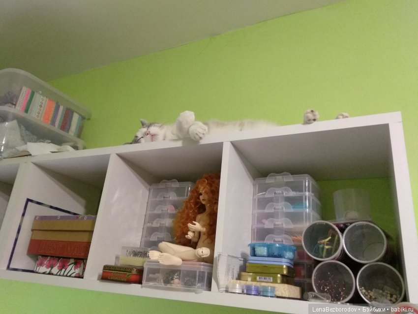 Ну, и про нас. Фаня- удивительно разумная кошка. Я ее подобрала совсем маленькой. Поскольку я человек рукодельный, у меня по всему дому разложены клубки, со станка свисают нитки мулине, на столе разложены пуговички, тесемочки и прочее и прочее. Фаня никогда и ничего не трогает! Кукол она тоже не трогает, но любит рядом с ними спать. И если я ей покажу новую куклу, то она потрется об нее, как бы одобряя. Ну, и, конечно, сидит рядом и вдохновляет на рукодельные подвиги.)))