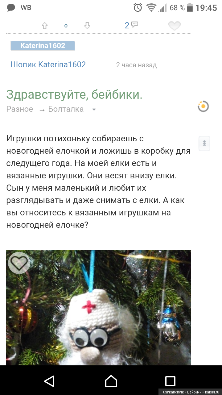 Игрушки потихоньку собираешь с новогодней елочкой и кладешь в коробку для следующего года. На моей елки есть и вязанные игрушки. Они висят внизу елки. Сын у меня маленький и любит их разглядывать и даже снимать с елки. А как вы относитесь к вязанным игрушкам на новогодней елочке?