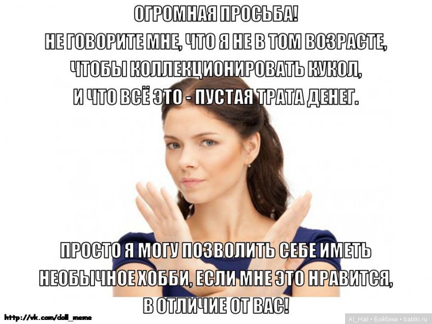 ОТВЕТ: Обычно такие комментарии оставляют взрослые тетушки пост бальзаковского или пред пенсионного возраста, которые считают, что, прожив энное кол-во лет, они имеют полное право вмешиваться в личную жизнь и давать очень личные советы и рекомендации, априори считая себя вправе на такое вмешательство. Такие люди даже не считают нужным залезть в мой аккаунт и посмотреть, сколько мне лет, есть ли детки, муж… Ну вот уверены они стопроцентно в моей абсолютно пустой жизни, которую я, бедняжечка такая, заполняю возней с куколками. Ну правда, мне иногда так смешно читать такое). На самом деле я взрослая женщина, примерно их лет, в 18 лет вышла замуж и всю жизнь прожила с любимым и единственным моим мужчиной, родив двух красивых и успешных сыновей, полностью реализовав себя в роли жены и матери, а теперь я еще и счастливая свекровь, спокойно и терпеливо ожидающая внуков))))))).