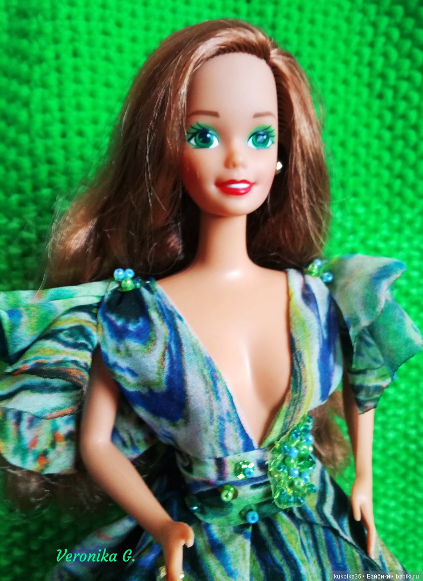 Платье по выкройке вот отсюда, только с дополнительными припусками на швы — всё же Те Самые Барби пофигуристей своих современных родственниц.