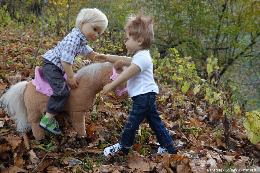 Лошадка просто замечательная, такая плюшевая, с настоящей уздечкой, седлом, стременами, с гривой, которую можно заплетать в косички! Конечно же в первые же выходные она поехала на дачу-помогать на фотосессии. Шарнирки особенно хорошо на ней сидят.