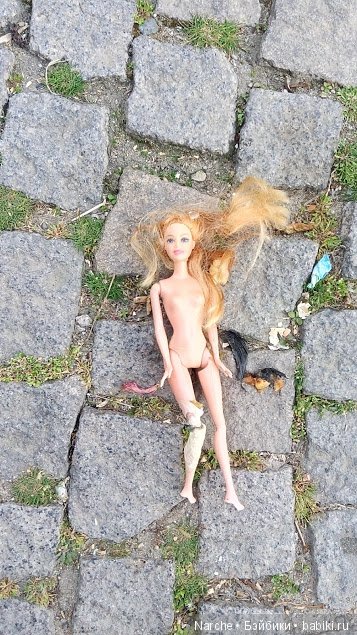 Но вот недавно ходила я гулять и увидела, что возле мусорного контейнера валяется псевдобарби со сломанной ногой. Вся в очистках.)) Но кто- то старался ее починить, нога была замотана строительным скотчем.