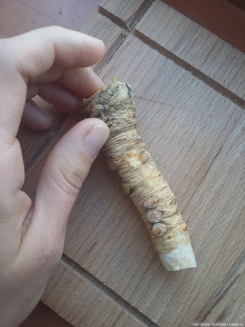 На фото обскоблила кончик. На 3-4 порции хватит кусочка толщиной в 3-4мм. Бросать конечно лучше ближе у концу варки. Можно даже не вылавливать и съесть.