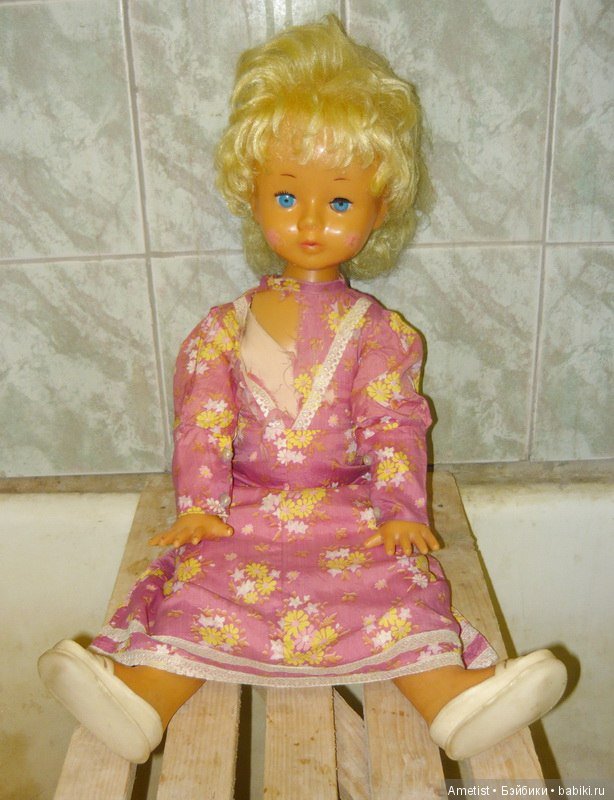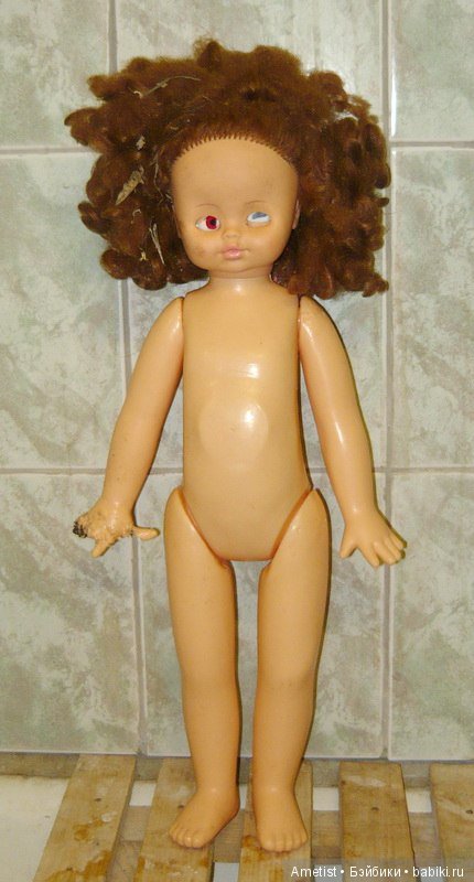 Нина! Большущая шагающая винтажка! И она не только шагает — но и головой вертит во время этого. Во всём родном — хоть и драном! И даже туфли сохранились — что редкость! Вот кто и зачем мог выбросить такую редкость? Нина — это ж мечта многих девочек 70-80-х годов!