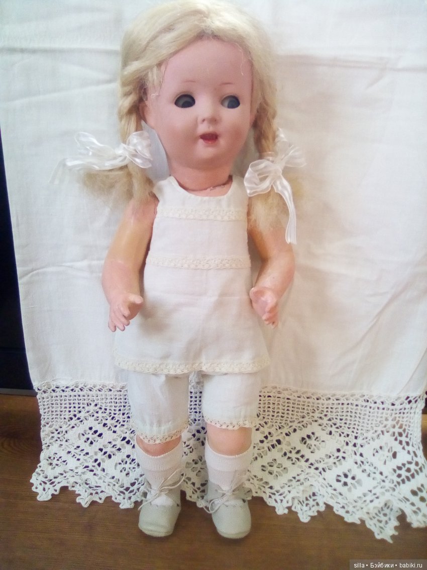 В какой-то момент не выдерживаю, беру её с комода, показываю мужу и начинаю эту свою историю рассказывать и говорить «ну никак не могу к ней привыкнуть. Продать её что-ли? Серьёзная она какая-то, личико совсем не детское, постарше и немного надменной мне кажется. Этакая серьёзная немочка». Помахала перед мужем куклой и поставила на место.