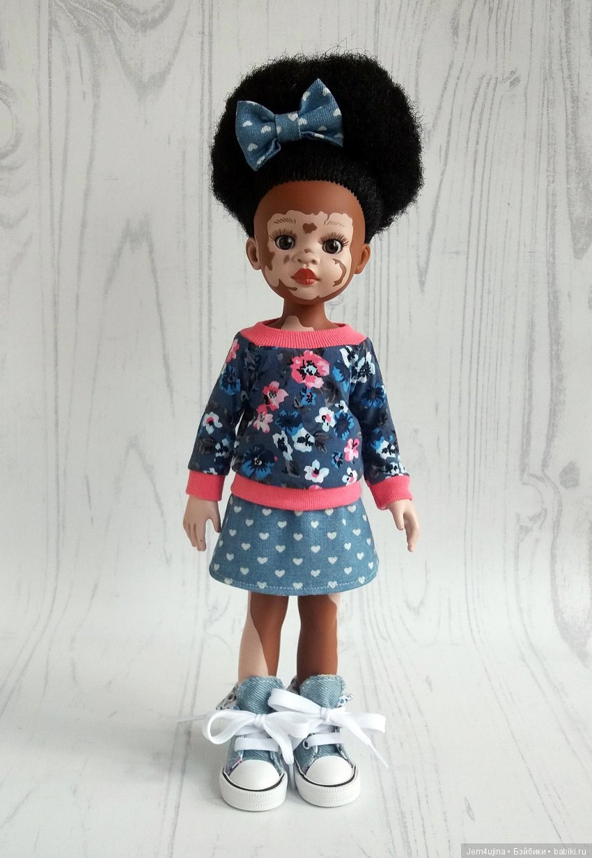 Пришлось снова ждать: пока к ним приедет новая партия, пока они отправят девочку на замену, пока она наконец доедет. В итоге моя малышка у меня и я очарована. Пока я ждала ее, подумывала продать альбиносика, ведь она изначально была заменой, значит, в новом доме ей будет лучше. Бедняжка Зури стала падать в шкафу, замкнулась, личико было совершенно несчастным. За день до приезда первой куклы я дошила наряд для нее, но поскольку кукла оказалась с дефектом и началась эпопея с заменой, наряд достался Зури. Переодела ее и поняла — не отдам) Малышка сразу повеселела и заулыбалась своей робкой улыбкой.