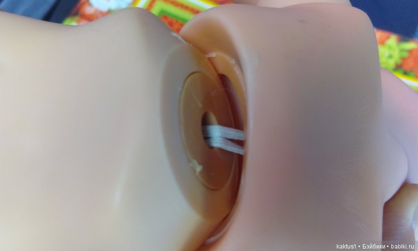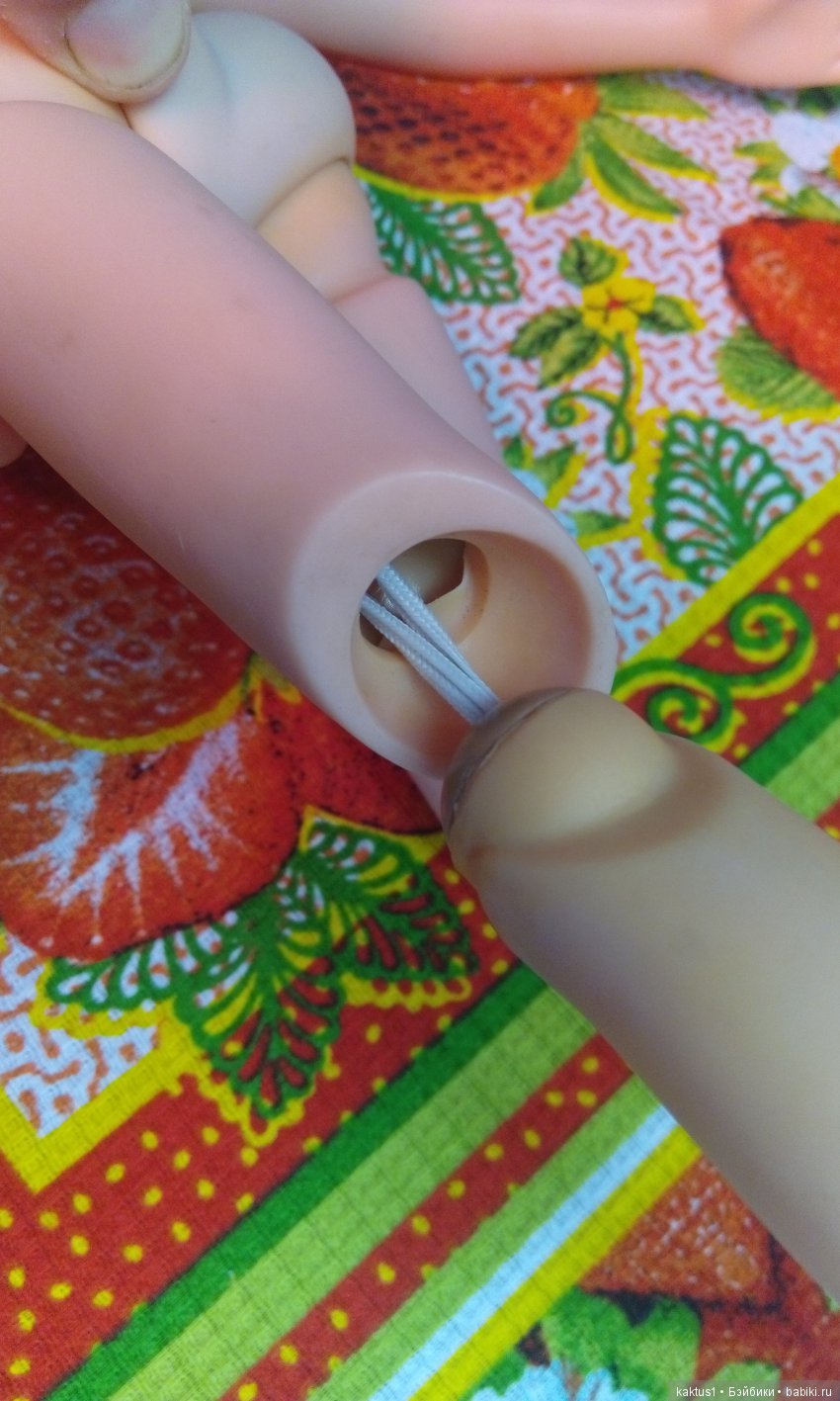 А вот с ногами засада: конец резинки в пластиковой такой втулке, которая намертво (или не совсем) вставлена в голень. У моей куклы на одной ноге она была откреплена, т.е. ее можно было вынуть, а вот вторая «замурована». Может, если аккуратно чем-то ее подцепить, эта втулка и вылезет, но я пока не решаюсь. И после вытаскивания они слишком легко входят-выходят, поэтому при натяжении могут выскакивать. Т.е. их надо как-то закреплять. И резинку надо крепить, мне кажется, через пружинку, как в некоторых медведях делают.