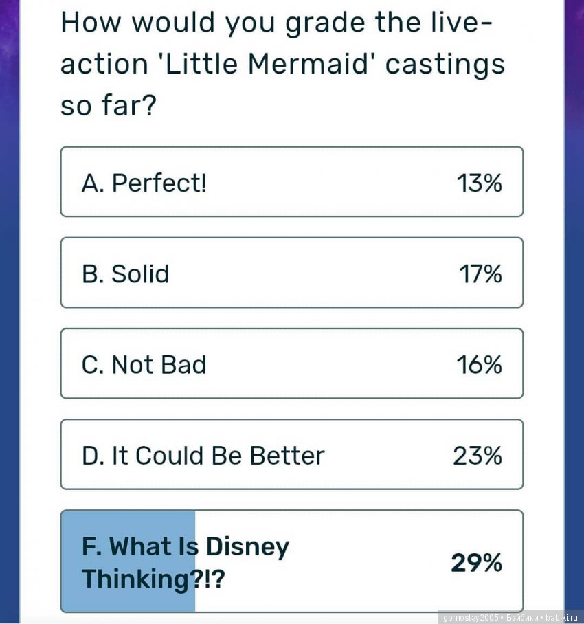 И откровенно говоря, впала в печальку, я ничего не имею против этой актрисы, но она настолько не „Ариэль“ что просто нет слов, и толлерантность тут совершенно не причём. На мой взгляд это неуважение к труду художников, которые создали такой замечательный образ, который нравится детям вот уже 30 лет. Проект переснятия мультфильмов становится всё более печальным, когда вышел Король лев, я пищала от восторга, но чем дальше, тем грустнее… В конце концов, хотите новую русалочку, снимите свой сюжет, как это было в Малифисенте, а если посягаете на классику, то извольте соответствовать )))