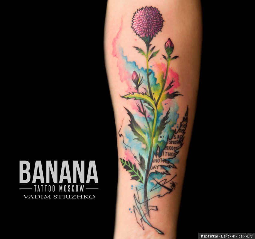 Когда я училась в универе, у одного из сокурсников была на плече цветная татуировка чертополох. Мне очень нравилось, когда её было видно.)