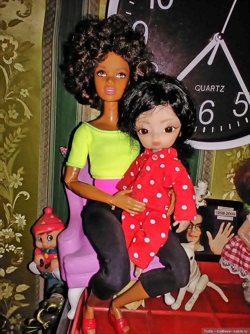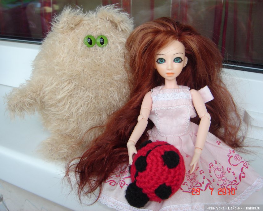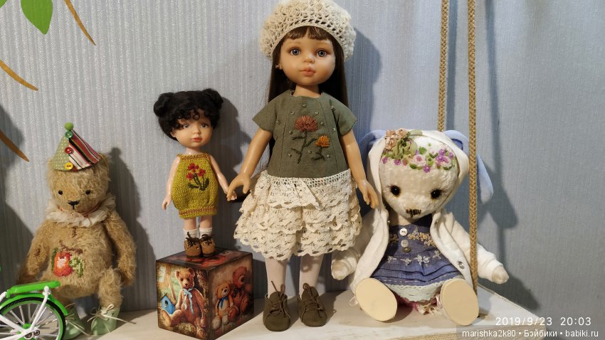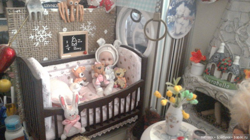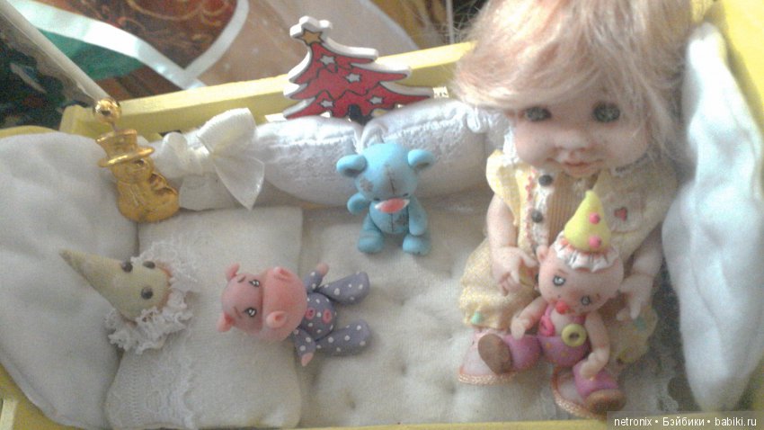 А это те самые малыши от Нелли, в родных кроватках и с игрушками — Мышка-малышка и Клоуняшик), он в рыжем съёмном паричке и на подушке его шапочка-колпачок, очень идёт ему...) Эти фото получились ещё более неудачные, т.к. с планшетом тяжело подлезть, вокруг другие персонажи сидят, стоят, лежат, играют...:))), подобраться невозможно для хорошего ракурса, просим прощеньица!...) Уж как вышло у криворукого фотографа!...))