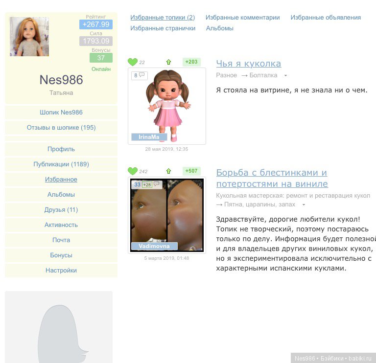 — и далее разделы «избранного» по сферам кукольных интересов, из может быть сколько угодно, например, «Барби», «БЖД», «Паолки», «Sylvia Natterer», «авторская шарнирная», «муклы», «аниме» и т.д.