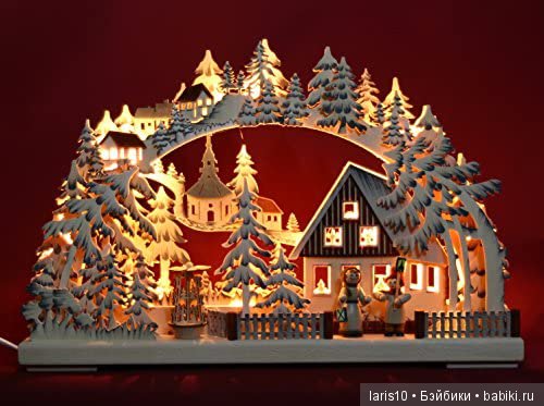 Это традиционные резные светильники, которые в канун Рождества немцы выставляют в окна.Задуманы они традиционно в натуральном тоне, т.е.не раскрашенные.Сейчас их можно увидеть в продаже во многих магазинах Германии.Lichterbogen это дуговая конструкция, но встречаются и пирамидальные и просто горизонтальные или просто как у Вас сценка из зимнего мотива.Еrzgebirge это местность в рудных горах в Саксонии на территории Восточной Германии.Резьба по дереву-народное ремесло с давних времен по изготовлению таких светильников, щелкунчиков, курильщиков и подсвечников в виде горнорабочего и ангела.Все фигурки сделаны в ручную, т.е.это местный народный промысел.Китай конечно начал их копировать.Их изделия не плохие, они дешевле, но настоящие все же отличаются по качеству.Вы можете в поисковике задать Lichterbogen Erzgebirge и можете увидеть все их разнообразие.Я бы не стала их раскрашивать… это вроде как покрасить русскую матрешку одним цветом без узора, хотя решать конечно Вам как поступить.