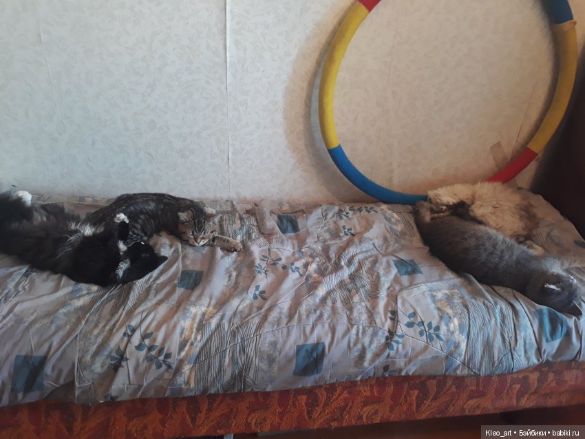 Наша великолепная четверка, две кошки и два кота на своей собственной кровати спят;)