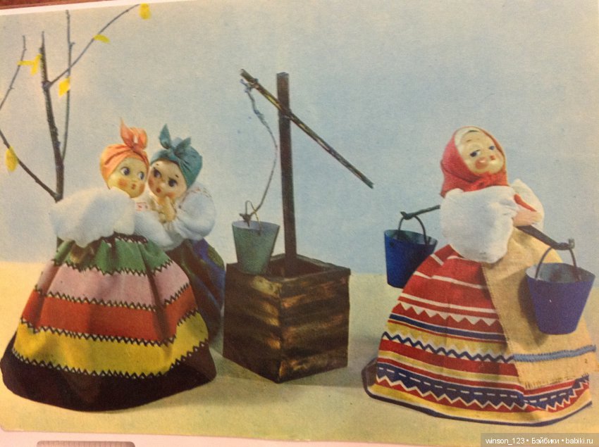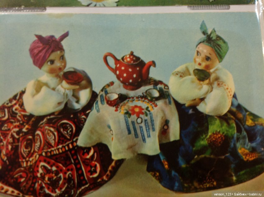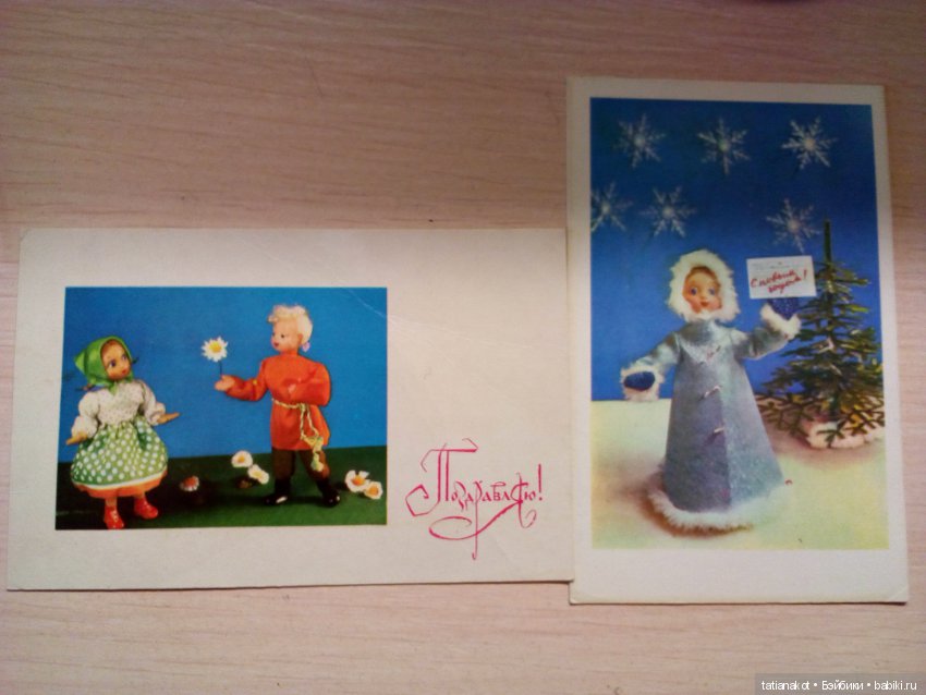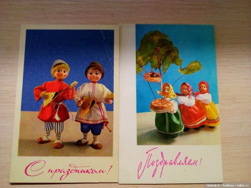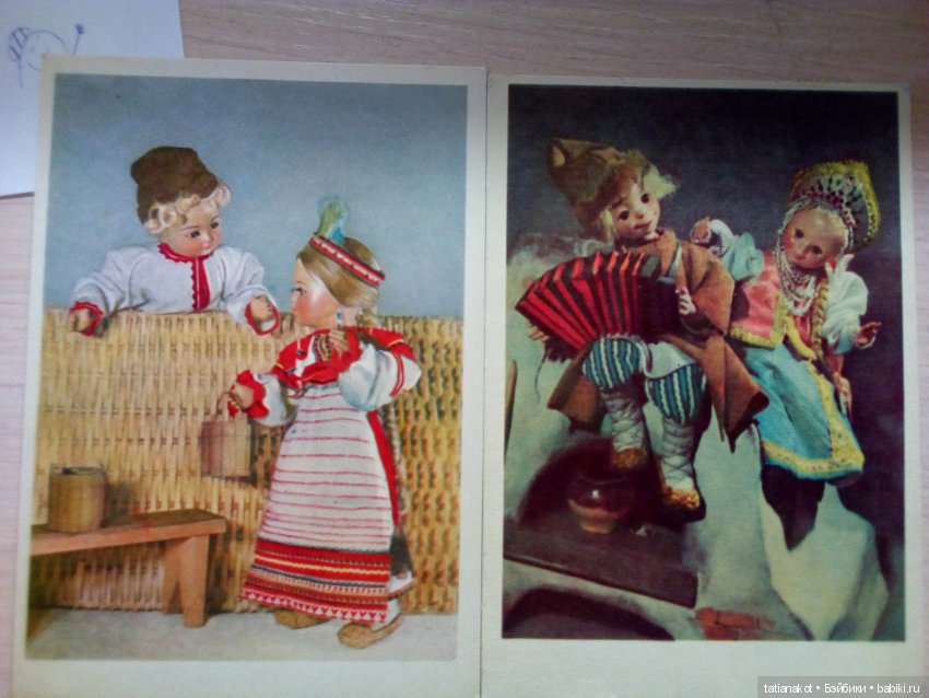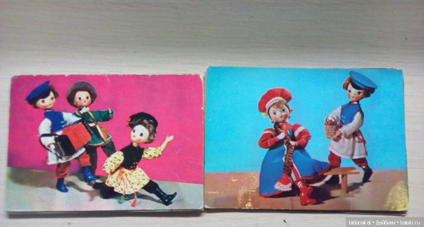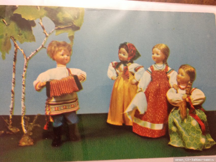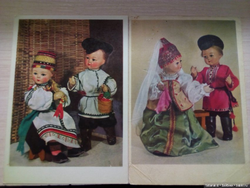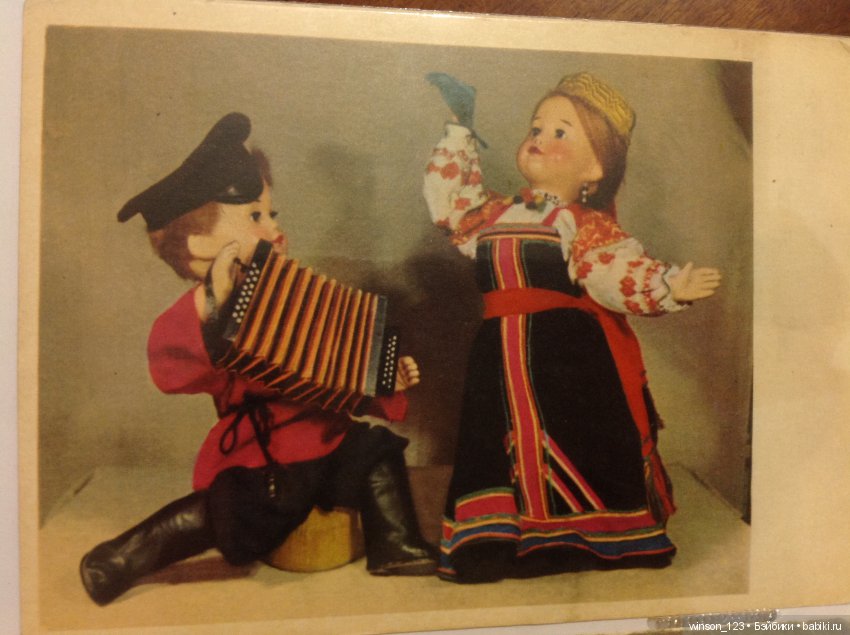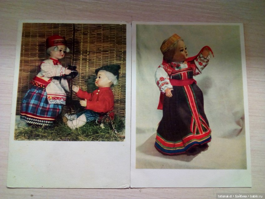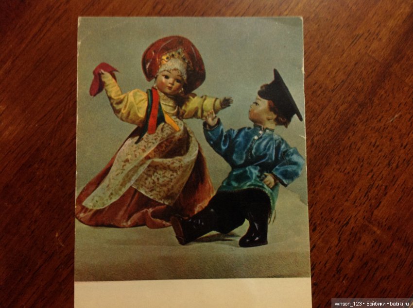 Всем здравствуйте! В 1968 году московское издательство «Советский художник» выпустило серию открыток «Русский сувенир» с изображением танцующих кукол. Художник Р. Спасская, скульптор И. Манухина. Помню, в детстве смотрела на эти открытки (у меня их было только две) и не могла поверить, что такие невероятной красоты куклы существуют на самом деле.