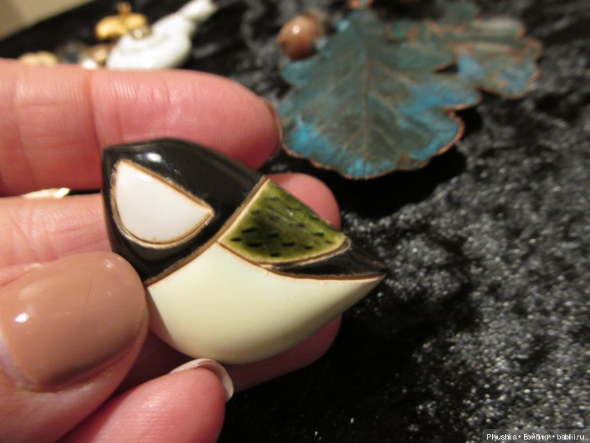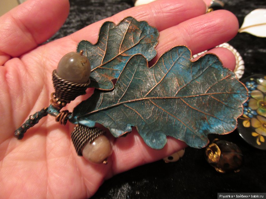 И три современные авторские броши: керамические птички и веточка дуба из меди с натуральным камнем (забыла название)