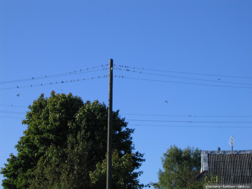 Этот день был тих и не жарок. Подняв глаза вверх, я удивилась-провода, тянущиеся от дороги к нашему дому, были сплошь заняты ласточками. Я стала их считать и обнаружила, что в этих птичьих посиделках участвовало более ста птиц. Так и просился вывод о птичьих смотринах. Взрослые показывали обществу своих отпрысков с гордостью и радостью.