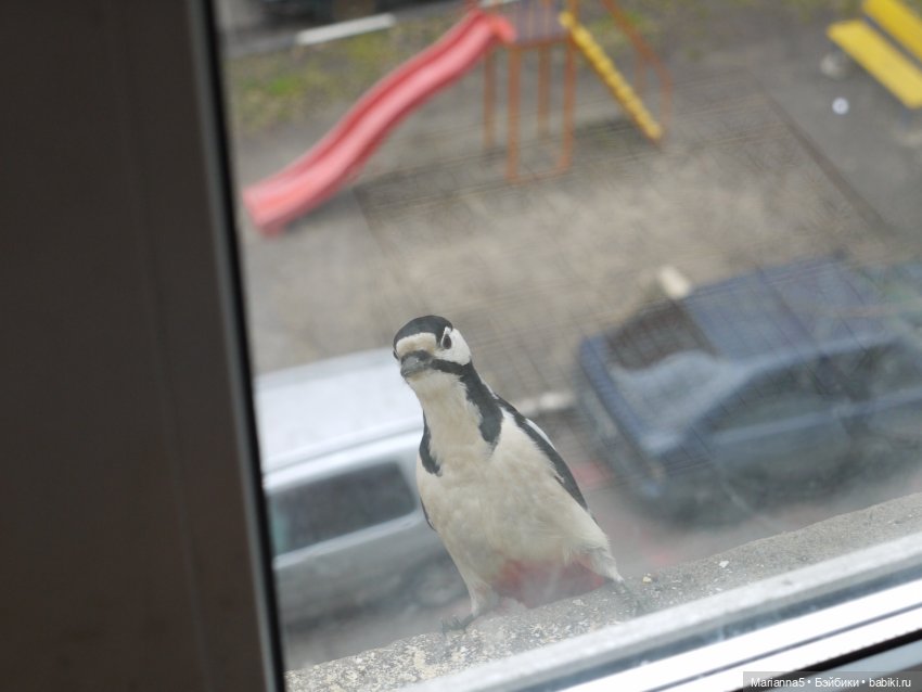 Пы.Сы. Сравнила фоточки и удивилась. Наши дятлы разные. У Вашей городской птицы у основания клюва тёмная окантовка, у наших деревенских — светлая (бежевая). О как!