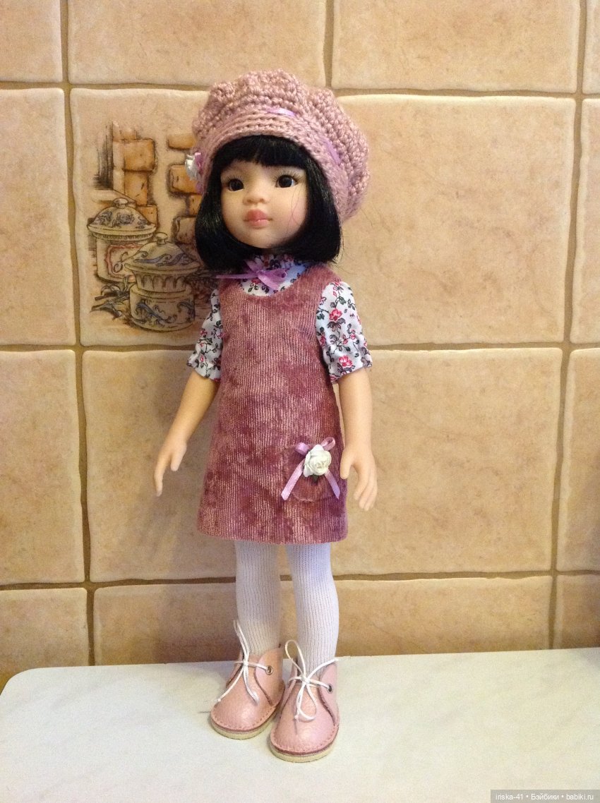 А этот " шедевр" Вам нужно вернуть обратно. Ничего схожего с тем, что было задано, на кукле сидит колом. Похоже, что мастерица не удосужилась даже разобраться в тонкостях пошива одежды для кукол, где важно учитывать и качество ткани, и специфику кукольной фигуры.