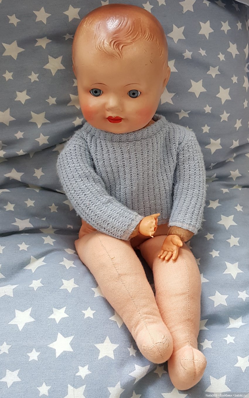 Здравствуйте! Этого малыша я уже обсуждала в предыдущем топике на тему опознания, мне сказали что он похож на «любимчика», но мне не даёт покоя голова, не могу понять из чего она? Ручки у нее, я так думаю, обгрызенный малышом целулоид, а голова похожа на керамику, но у нее очень глухой звук при постукивании, у фарфора на много звоноче. И потом если капнуть воду на внутреннюю (матовую) поверхность головы она намокает как бумага, а на внешней блестящей (глянцевой?) нет. Еще внутри куклы поверхность белая шероховатая с вкраплениями, и если провести пальцем то остаётся, что то вроде белого порошка. Снаружи поверхность блестящая, и очень гладкая.