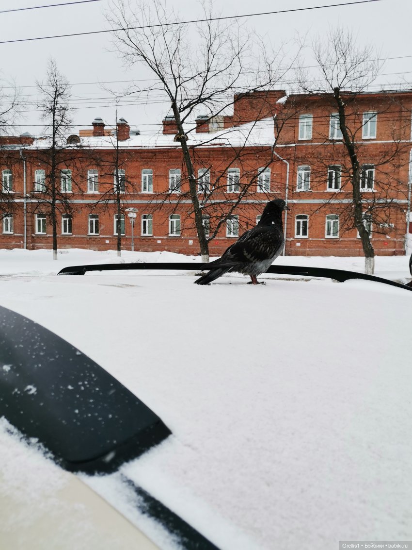 Голубь, фиг его знает… Мы от магазина отъехали, слышим на крыше что-то стучит странно. Вышли глянуть, а там ОН!)) Еле согнали! Может устал и решил с ветерком проехать))