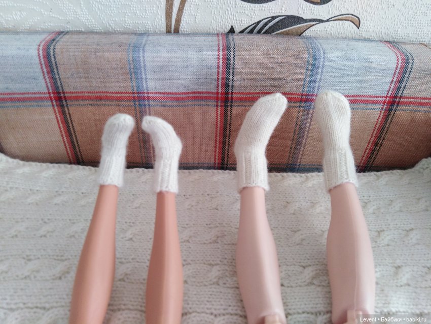 Вчера вечером легла спать, как порядочная, в 11 вечера. Думала выспаться и встать утром, а не глубоко за полдень. Но вот и фиг-то. Поспала пару часов и проснулась, и в голове сразу мысли о повязушках, масса планов и прямо активность такая образовалась. Полежала, придумывая и продумывая планируемые повязушки в надежде всё-таки уснуть. Придумала попробовать связать носочки на двух спицах. Вяжут же такие, даже для людей. Правда, я такие никогда не делала, всегда считала, что без шва однозначно лучше. Но. Первые носочки для барби вязала на 4 спицах 0,8 мм, из тоненьких ниточек, на 24 петли… Это что-то! Вяжущие поймут! Больше крутишь вязанье, чем вяжешь. Туго не затянешь — иначе фиг в петельки спицы заведёшь, не слишком туго — спицы норовят вылететь из петелек… В общем, решила таки попробовать на двух. И не прогадала! Вяжутся втрое быстрее! Никуда ничего не вылетает, не цепляется, красота! Правда, получаются со швом, естественно, но он тонкий и не особо заметный. В общем, мы очень довольны! Примеряем, разглядываем, радуемся и удивляемся!