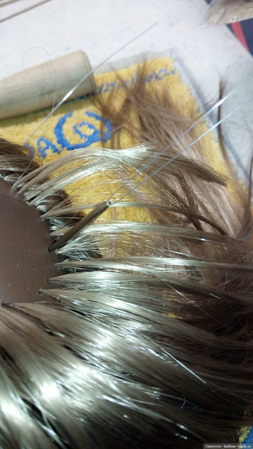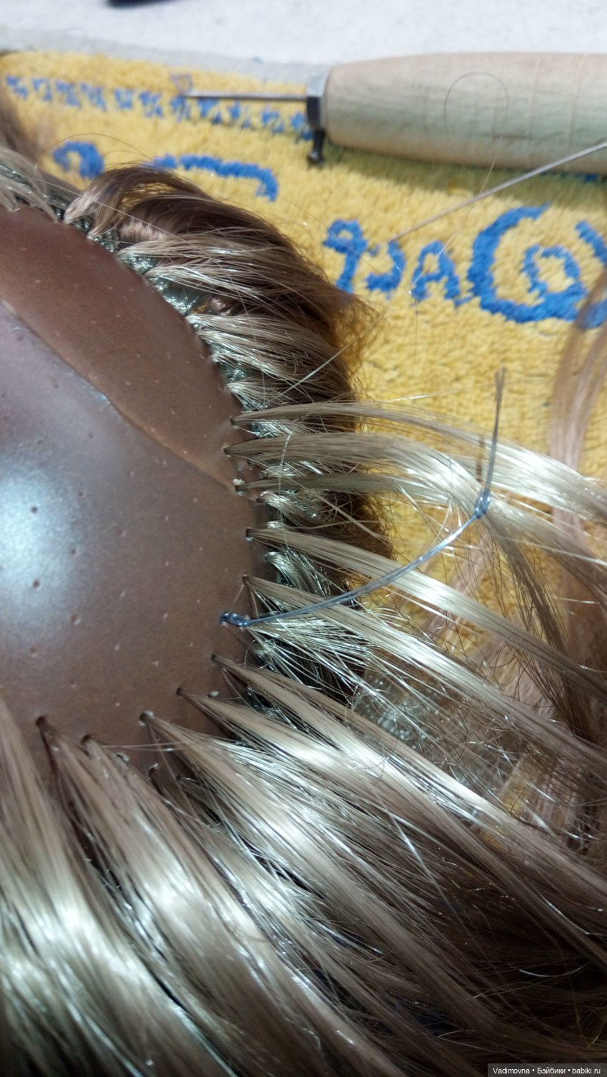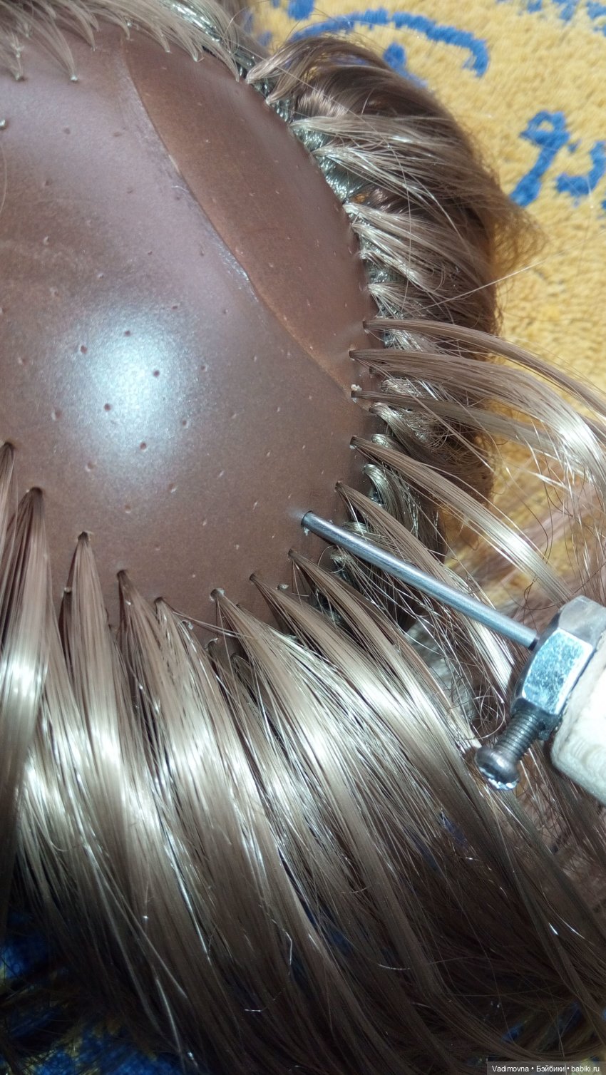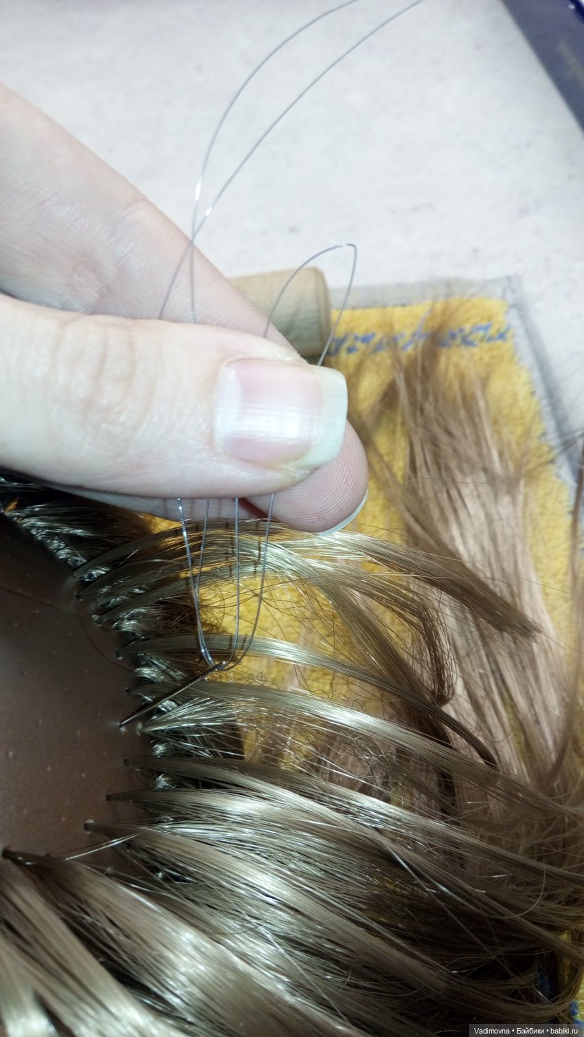 В труднодоступных местах (виски, над шеей) винил грею, чтоб был мягким. Тогда игла при проходе через прокол под углом не ломается. В конце всю голову прогреваю горячим феном, тогда растянутые шилом проколы сужаются и локоны держатся очень прочно. Но это возможно только если трессы для прошивки термостойкие, иначе поплавятся.