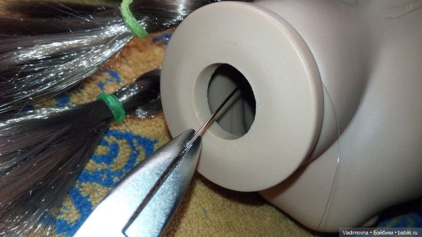 Прошиваю так: делаю или растягиваю имеющийся прокол шилом, затем тонкую длинную (12см) иглу и продетую в ушко петлю из лески вставляю в прокол снаружи головы и вывожу через шею. Если длины иглы не хватает, помогаю длинногубцами. Конец петли оставляю снаружи. Снимаю иглу с лески, вдеваю в леску локон и вытягиваю локон за конец петли через шею на поверхность головы.