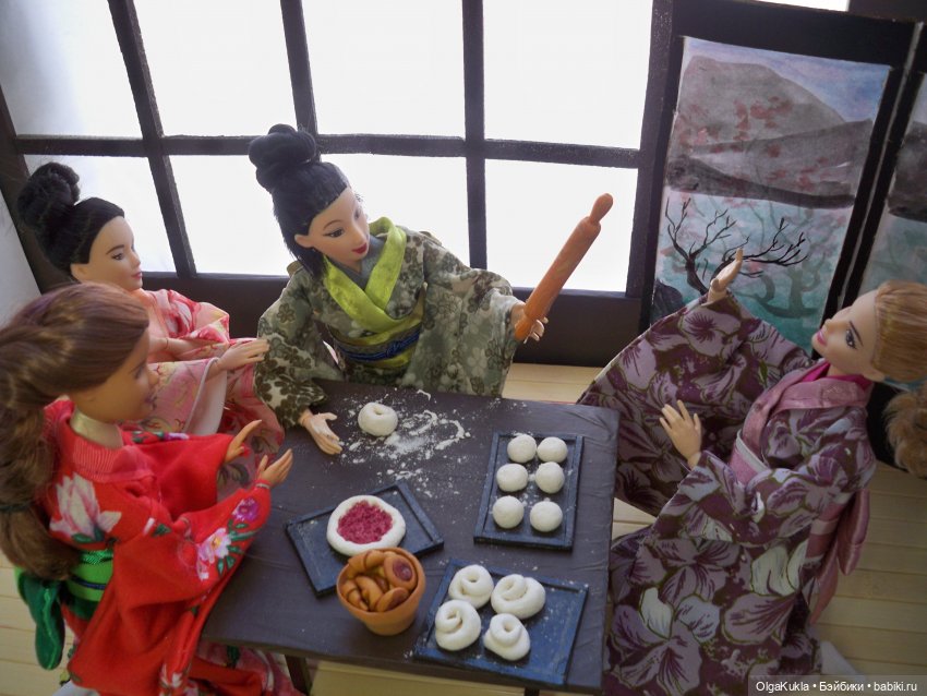 Для артистов пошилось 4 женских кимоно и 2 мужских наряда, для остальных просто наматывала лоскуты на куклу.