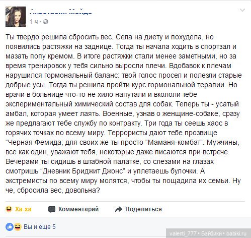 Но именно вчерашнее тебе бы похудеть на кг 20 от дамы, скажем, чуть большей весовой категории. И совет про соду… и что моя работа- не работа, баловство и куколки- как старческий маразм.