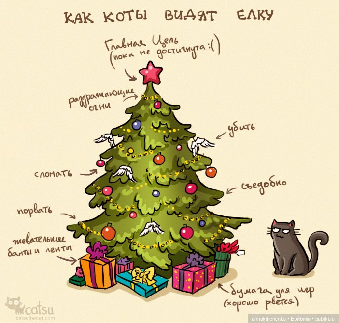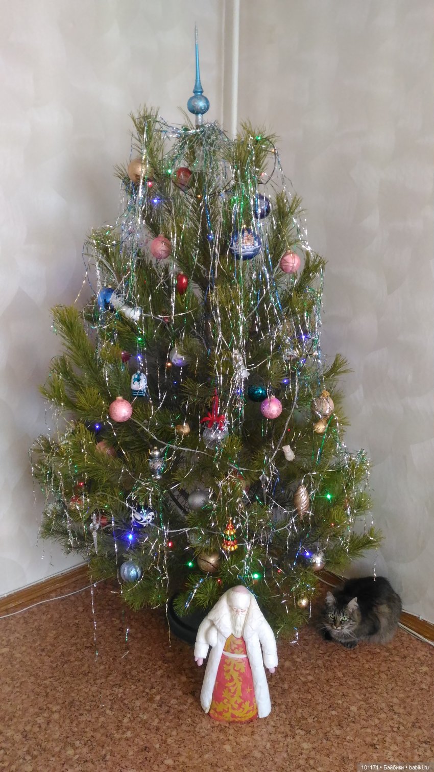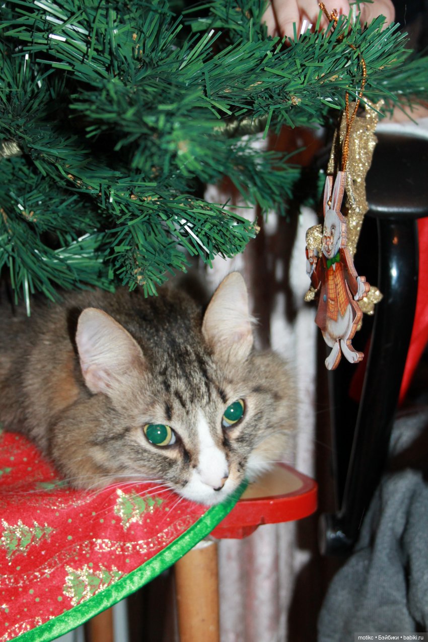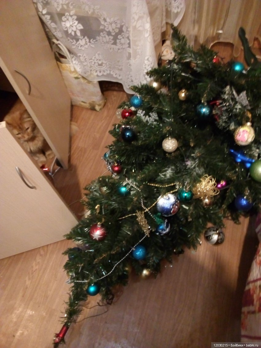Елку коты роняли неоднократно, стали привязывать, стеклянные игрушки не вешаем. Одна малам в елке «свила» себе гнездо, другой просто по ней как по дереву забирается, третий просто шарики снимает и гоняет их по квартире, вобщем, сплошная вакханалия