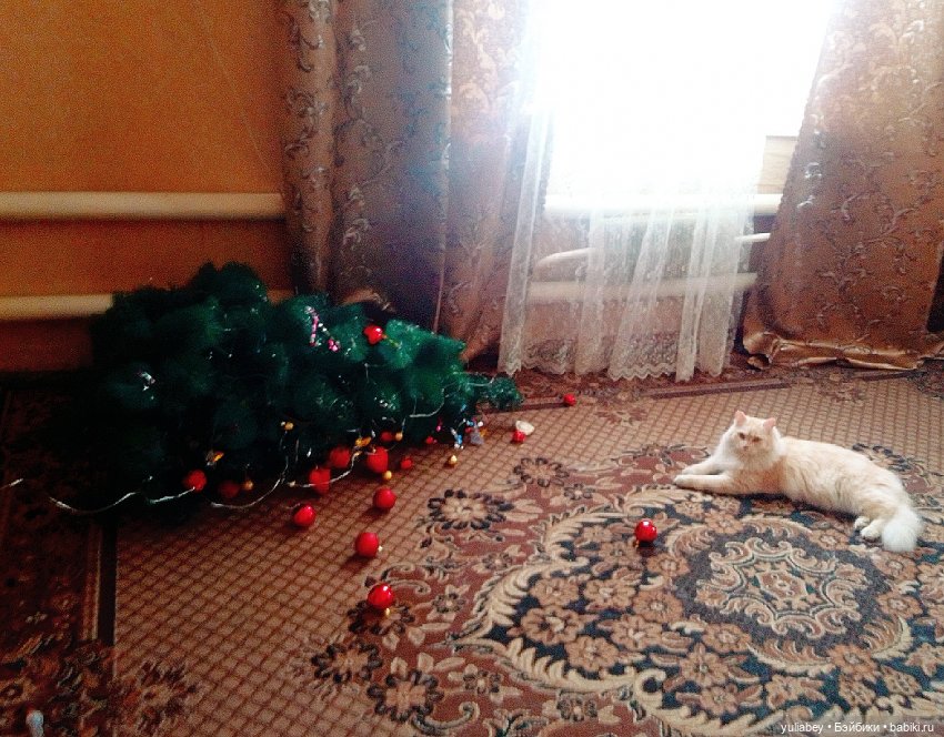 Мои кошки елку не роняли, но жрали дождик. И звенели игрушками среди ночи.