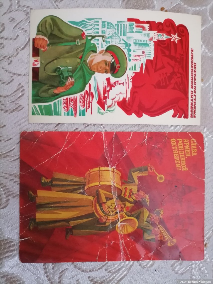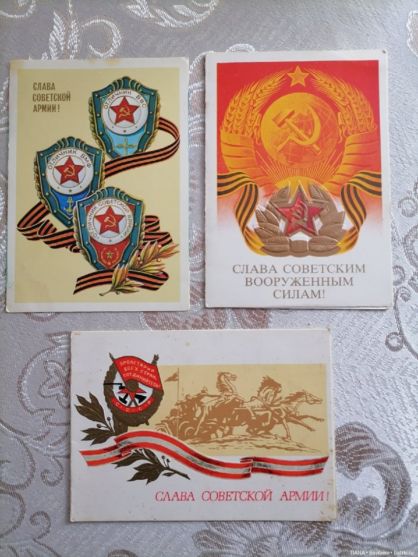 Вот сей час смотрю ваши открытки и на втором фото слава советской армии с конницей — я её вспомнила, у соседей видела, у деда. Я к ним часто забегала, мои родители с ними дружили крепко. И я приходила мне бабушка давала играть открытками. А некоторые отдавала. Это прям праздник был!