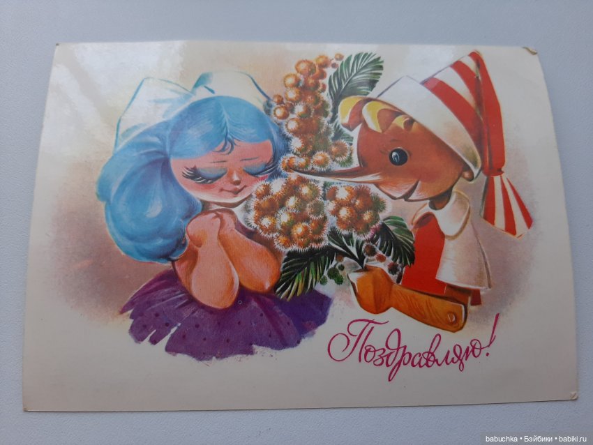 А на открытке с Буратино — какой шикарный букет! Тут тебе и полевые и садовые цветы. Букет на столько огромный, что один цветочек выпал и над ним красивая надпись 8 МАРТА.