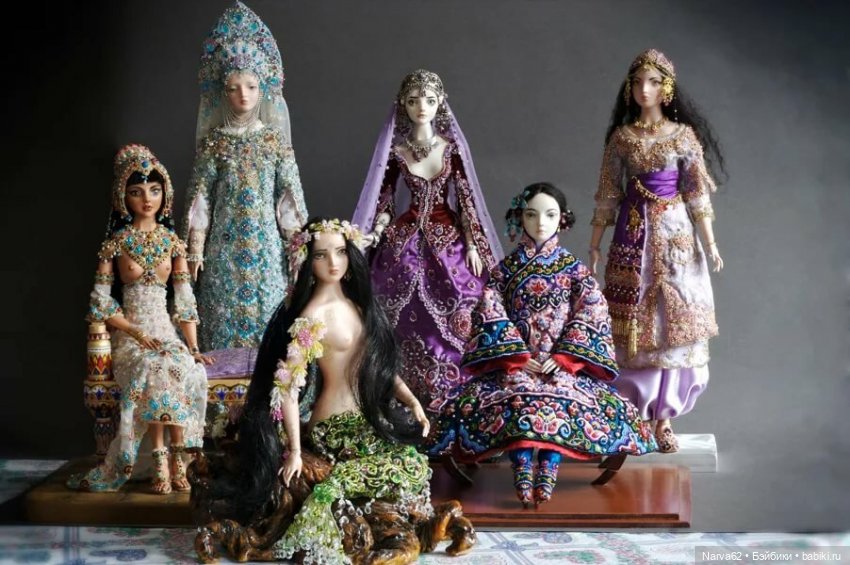 Куклы Бычковой — арт-объект и вложение денег. Их наряды изготовлены с использованием золота, серебра (и высоких проб, не самоварное золото) и драгоценных камней (вплоть до бриллиантов). Там нет просто бисера и бижутерного сплава.