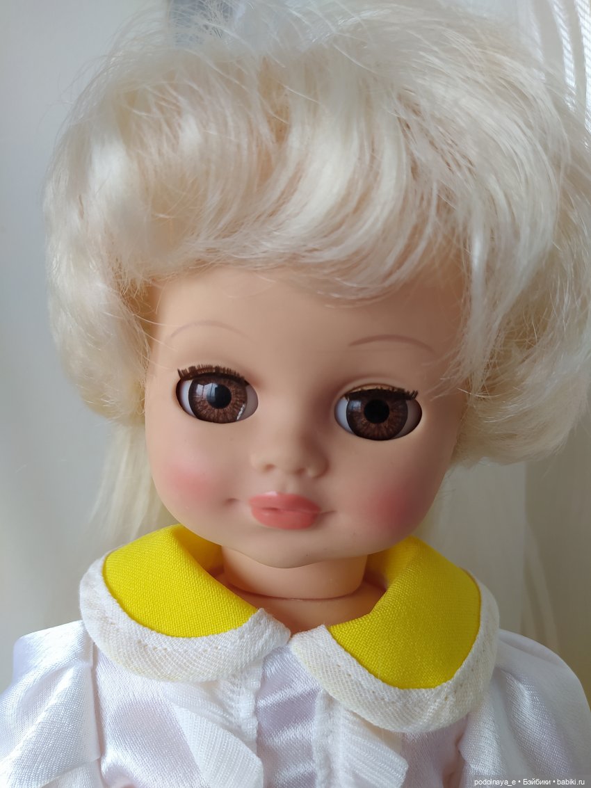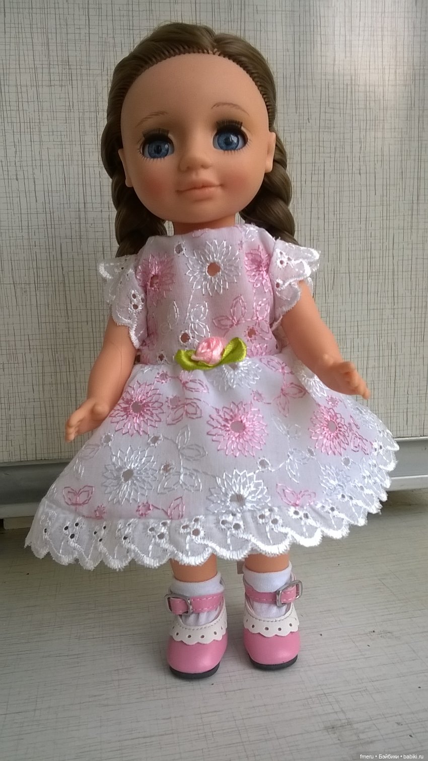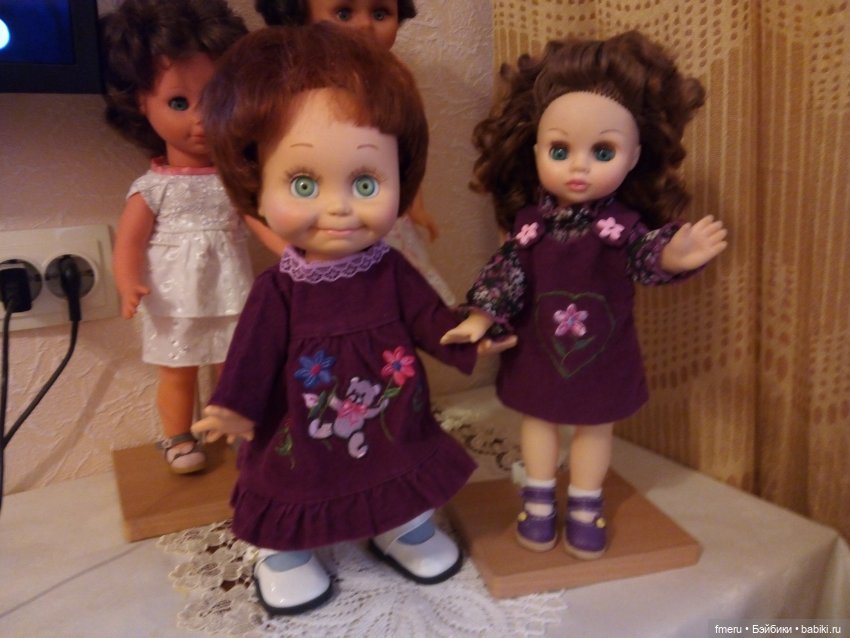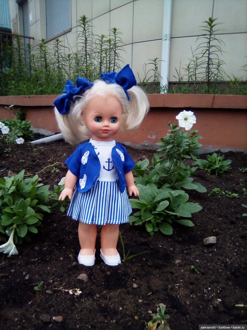 Здравствуйте! Эта девочка — веснушка приглянулась мне своим необычно чистым взглядом. Так не хватает чистоты. Было написано, что обуви нет, платье подбор. Да ерунда все это, когда смотрят на тебя такие глаза. Она стала второй куколкой, которую я купила. И первым разочаровнием. Я тогда не знала, что почти у всех веснушек непропорцианальное тело и нелепые толстые ножки. Платье ей было явно мало и скрывало и без того коротенькую шейку. Живой взгляд оказался результатом мастерства фотогрофа. Я приуныла. Кстати, ее шелковое платье никак не вписывалось в общий план. У моих девченок платьишки скромнее, на ее фоне, они стали совсем простушками… Кроме того, никто не мог назвать ее настоящего имени, а она отказывалась. Решила продавать, но тут вздыбырился мой вечно сворливый муж — не сметь, она единственная мне симпатична. Повелеваю — дружить! Ну, значит надо. Когда остались мы дома одни, взяла ее в руки и стала крутить. Что же нам делать? Шить я не умею, а уж выкройку тем более не построю. Даже простую, даже… Ой, так погоди-ка… был же грязный ничейный комбезик. Примерим. Есть! Распороли и понеслось. Конечно мы подружились! Сказала, что она Анютка, что очень расстроилась, что не пришлась мне по нраву. Такая тискательная девчушка оказалась. И болтает по теме. Вот наши наряды. Не судите строго. Мы только учимся!